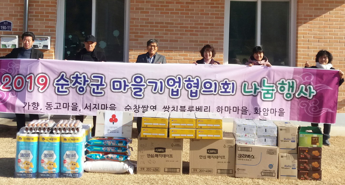 - 순창군 마을기업협의회(회장 임종우)는 26일 우리 노인요양공동생활가정시설과 행복한동행 노인요양공동생활가정시설을 방문해 쌀, 한과, 기저귀 등 생활용품을 전달했다. -2019년 1월 26일-