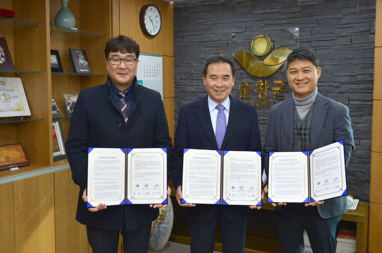 - 순창군과 싱그람(주), 한국절임(주)은 26일 황숙주 순창군수와 각 회사 대표들이 참석한 가운데 절임류 사업 발전과 지역농산물 판로 확대를 위한 업무협약을 체결했다.이날 협약식에서 황숙주 군수와 싱그람(주) 이경희 대표, 한국절임(주) 강용관 대표는 절임류 사업발전과 지역농산물 판로 확대를 위해 공동 노력하기로 합의했다.이번 협약은 순창군과 순창군 출자기관인 한국절임(주), 절임류 전문업체인 싱그람(주)이 전략적 업무제휴를 통해 절임류 사업에 공동참여하고 지역농산물 판로확대를 통해 지역경제 발전을 도모하고자 추진됐다. -2018년 12월 26일-