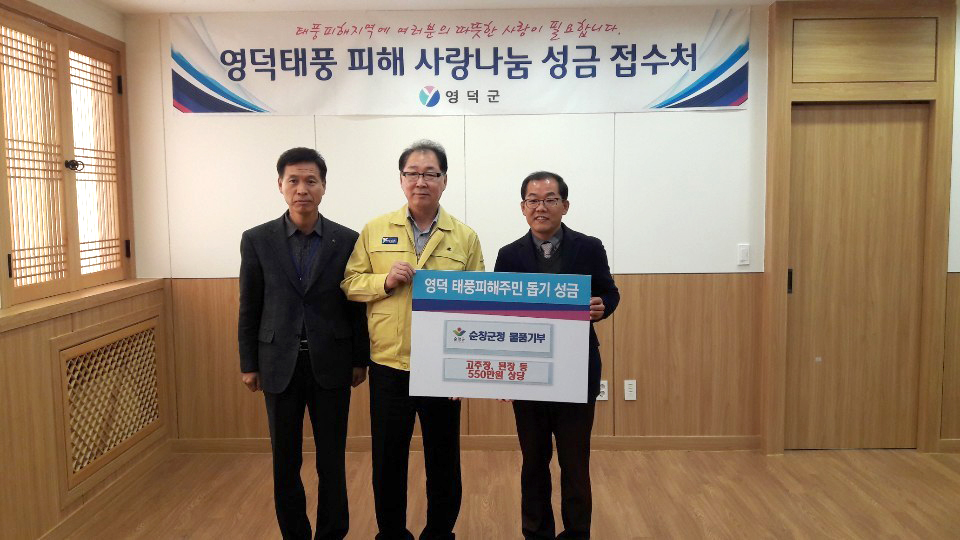 - 17일 연말연시를 맞아 지난 10월 태풍 콩레이로 인해 수재 피해가 발생해 현재까지 완전히 복구가 되지 않은 경북 영덕군을 찾아 의연물품을 전달했다.이번 수해 의연품은 순창군 소재 대표기업인 대상(주)(청정원)과 (주)로터스에서 영덕군 수해지역 이재민들을 위해 사용해 달라고 기부한 장류제품과 생수다. -2018년 12월 17일-