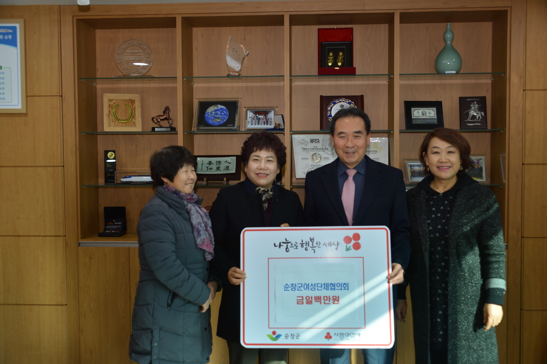 - 순창군 여성단체협회(회장 김삼순)는 18일 군청을 찾아 어려운 다문화가정을 돕기 위한 이웃돕기 성금 100만원을 황숙주 군수에게 전달했다. -2018년 12월 18일-