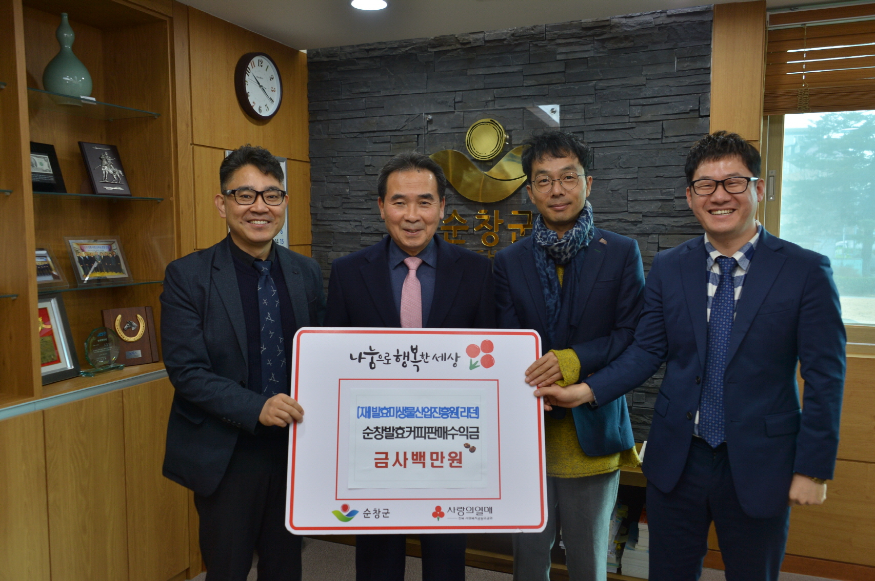 - 순창발효커피 판매수익금의 2%인 400만원의 이웃돕기 성금을 기탁했다. (재)발효미생물산업진흥원(리턴)과 피터오(본면 오형일)는 발효커피 콜라보 디자인 사용권으로 판매수익금의 2%를 이웃돕기에 쓰기로 약정한 바 있다. -2018년 12월 18일-