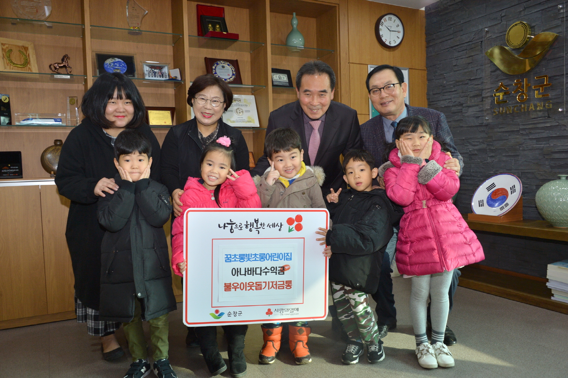 - 꿈초롱빛초롱 어린이집 아이들이 올해도 동전모으기 행사를 통해 모은 이웃돕기 성금을 기탁했다. 19일 어린이집 아이들은 순창군청을 찾아 황숙주 군수에게 어려운 이웃들에게 써달라며 기탁했다. -2018년 12월 19일-