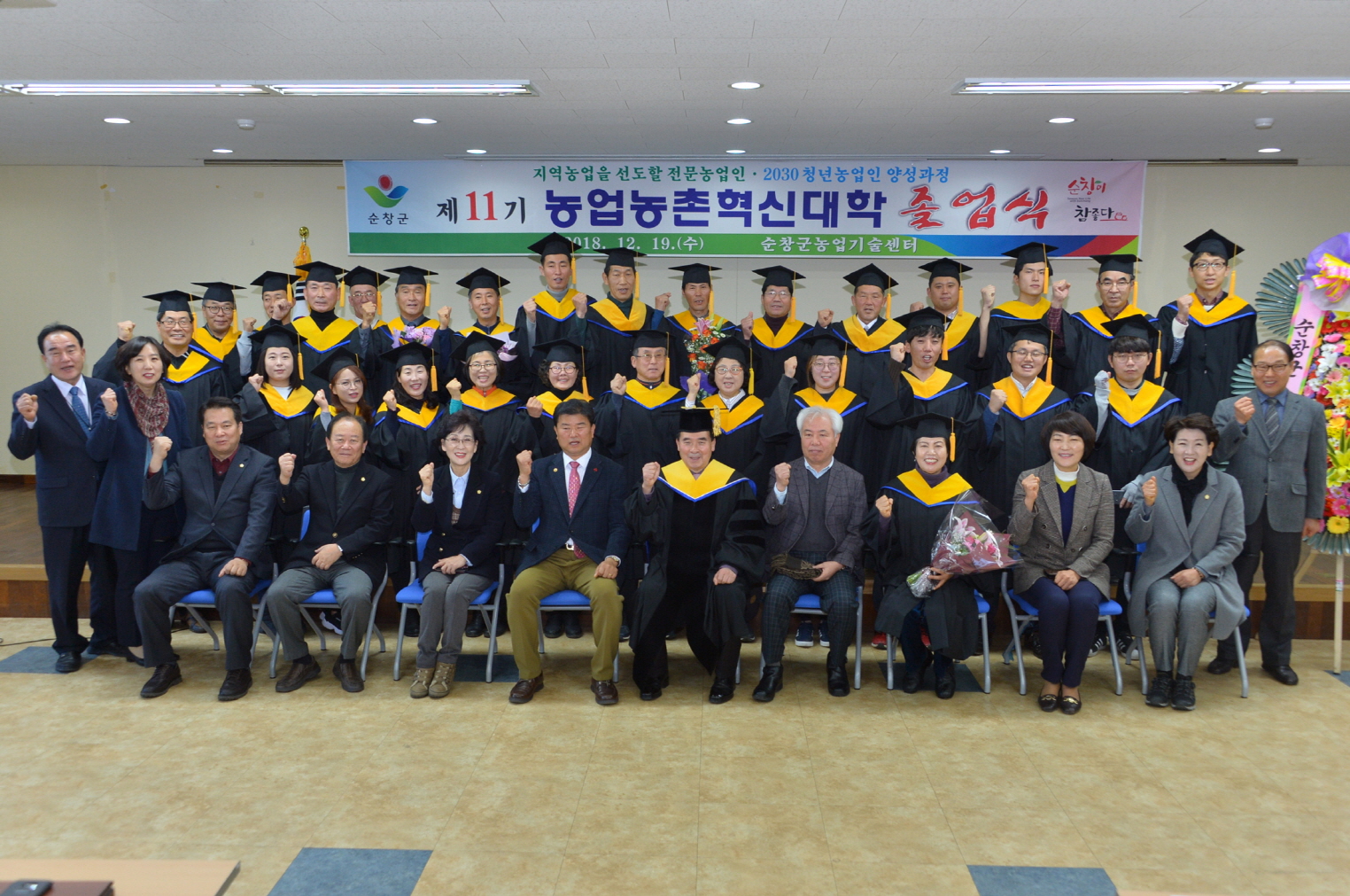 - 19일 전문농업인반과 2030청년농업인반 등 농촌혁신대학 2개 과정 졸업식을 가졌다.졸업생 31명은 지난 3월에 입학해 유명강사를 초빙한 33개 강좌의 집합교육과 국내 선진농업 현장견학 5개 강좌 등 총 38강좌를 수강했다. 강좌는 농산물 마케팅과 친환경농업, 농가 경영개선 등을 중심으로, 농촌체험과 리더십 등 농업의 다차산업화를 촉진할 수 있는 전문농업인의 능력과 자질을 향상시키는 데 초점을 맞췄다. -2018년 12월 19일-