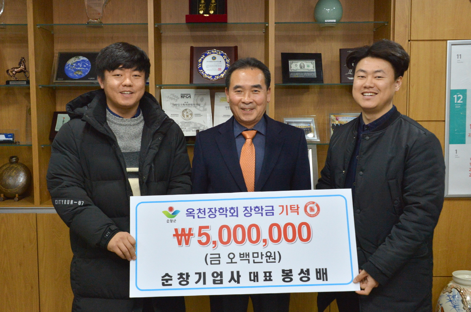 - 12일 순창기업사 봉성배 대표는 옥천장학회 장학금으로 5백만원을 기탁했다. -2018년 12월 12일-