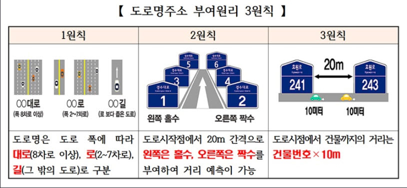 - 순창군은 304곳의 도로명주소 마을안내판 교체와 찾아가는 홍보캠페인 등 도로명주소 기본원리, 검색방법 등세가지 원칙을 적극 알릴 계획이다.첫 번째 도로 폭에 따라 나뉘는데 ‘대로’는 폭 40m 이상이거나 왕복 8차로 이상인 도로, ‘로’는 폭 12m 이상 40m 미만이거나 왕복 2차로 이상 8차로 미만인 도로이고 ‘길’은 대로와 ‘로’외의 도로를 말한다.두 번째로는 도로 시작점에서 도로는 서→동, 남→북으로 진행되고 20m 간격으로 도로의 왼쪽은 홀수, 오른쪽은 짝수 번호가 부여되는데 이것이 ‘기초번호’다. 이렇게 건물 순서대로 부여된 번호에서 주된 출입구에 가장 가까운 도로의 기초번호를 사용해 `건물번호`를 부여하게 된다.마지막으로 도로 시작점에서 건물까지 거리가 ‘건물번호×10m"이라는 것이다.“장류로 383”은 장류로의 시작점에서 거리가 3.83km(3,830m) 떨어진 왼쪽에 위치한 건물로 현재 순창교육지원청이 위치하고 있으며 도로명주소로 건물의 위치를 파악할 수 있다. -2018년 12월 10일-