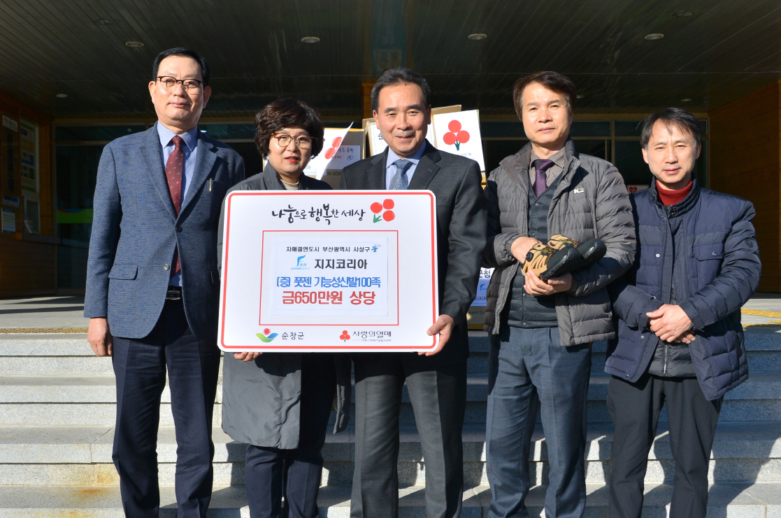 - 10일 순창군과 자매결연도시인 부산광역시 사상구(구청장 김대근)에 소재한 지지코리아(대표 이향숙)에서 순창군 저소득층을 위한 기능성 신발 100족(650만원 상당)을 기탁했다. ㈜지지코리아는 신체균형이 무너지기 쉬운 평발의 단점을 보완해 척추를 바로잡아 올바른 자세를 유지해주는 기능성 신발 업체로, 전국에 34곳의 지점을 가지고 있다. -2018년 12월 10일-
