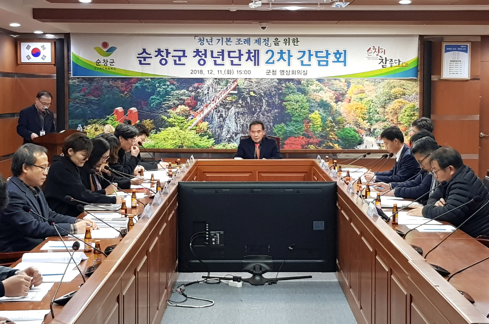 - 11일 군청 영상회의실에서 청년 기본조례 제정을 위한 청년단체 대표 2차 간담회를 개최했다.이번 간담회는 지난 9월에 이어 두 번째로 개최했으며, 면 청년회 회장, 청년회의소, 마을공동체 지원센터 대표 등 20여명이 참석한 가운데, 순창군 청년 기본 조례 안 세부 조항에 대한 폭넓은 의견을 교환했다.순창군 청년 기본 조례는 청년 정책에 관한 기본계획 수립, 청년정책 위원회의 설치 및 구성, 청년정책협의체의 운영, 청년정책의 사업 추진 등에 관한 내용을 담고 있다. -2018년 12월 11일-