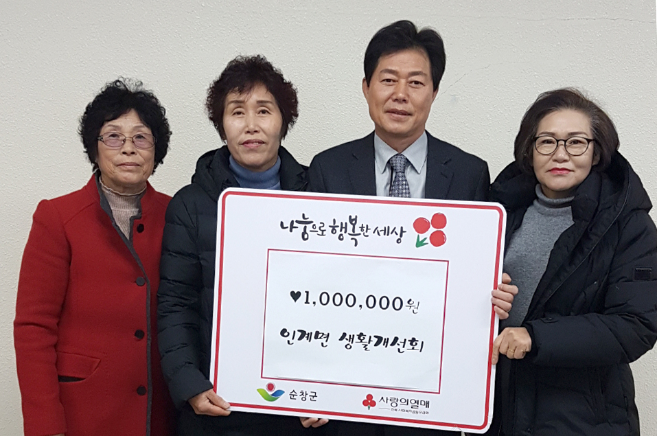 - 11일 인계면 생활개선회(회장 임인숙)는 이웃돕기 성금 100만원을 인계면에 기탁했다. 이날 기탁금은 인계면 생활개선회가 한푼 두푼 회원들의 성금을 모아 마련한 것으로 이날 전달된 성금은 인계면 지역사회보장협의체에 기탁돼 관내 어려운 가정에 지원될 예정이다. -2018년 12월 11일-
