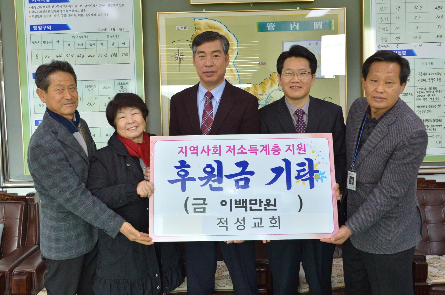 - 12일 적성교회(목사 설상원)에서 적성면사무소를 찾아 200만원을 기탁하며 나눔 행렬에 동참했다. 설상원 목사는 “연말을 맞아 어려운 이웃을 돕기 위해 성금을 마련했다”며 “어려운 이웃들이 따뜻한 겨울을 보내는 데 조금이나마 보탬이 됐으면 좋겠다”고 기탁소감을 밝혔다. -2018년 12월 12일-