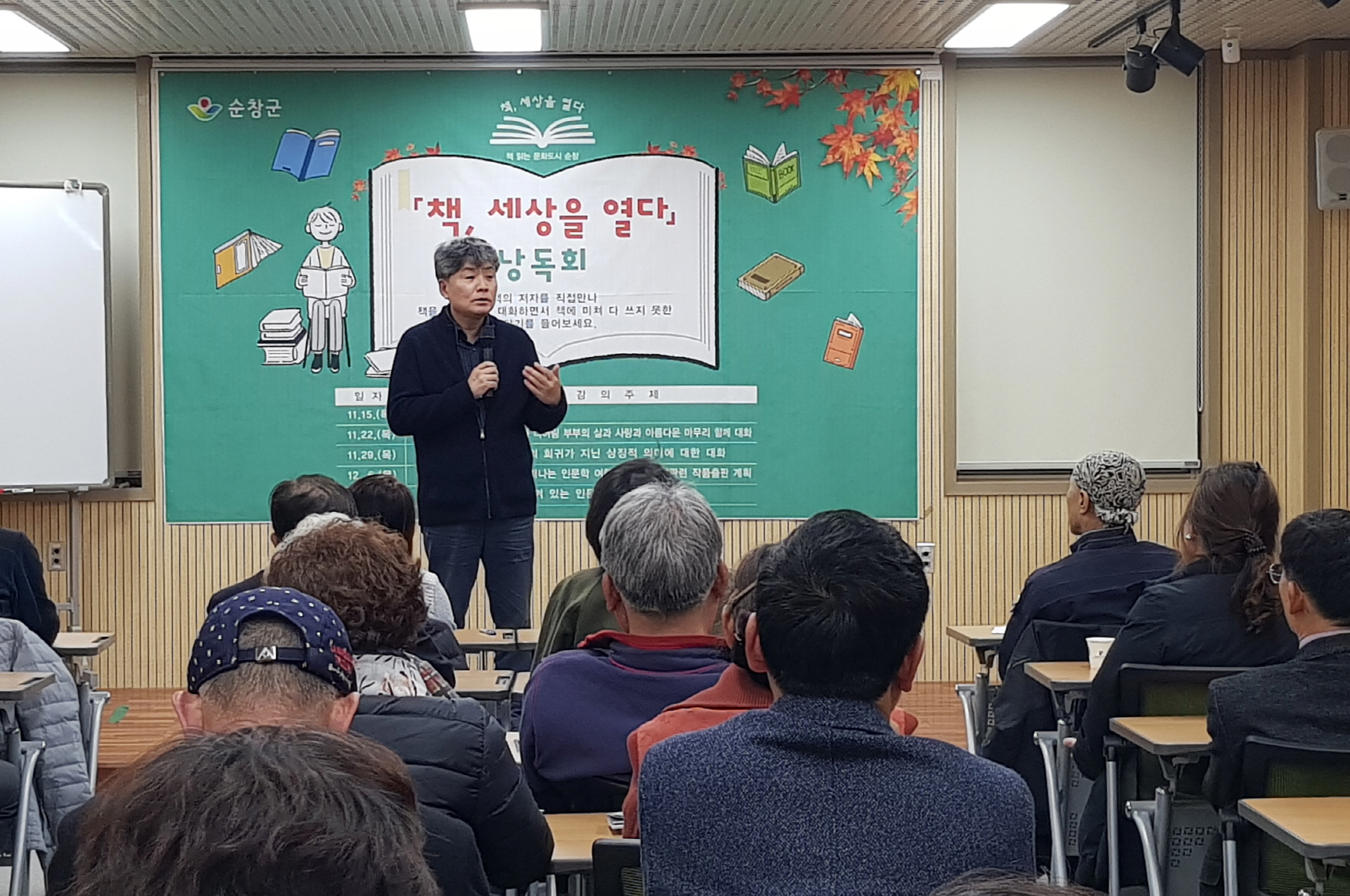 - 순창군(군립도서관)이 15일 오후 7시부터 군립도서관 문화강좌실에서 청소년과 공무원, 지역주민을 대상으로 강원국 작가를 초청해 「대통령의 글쓰기」 인문학 특강이 열렸다.이번 특강은 「책, 세상을 열다 낭독회」 의 일환으로 진행되며, 2018년 인문독서아카데미 상반기 우수 수행기관으로 선정돼 한국출판문화산업진흥원의 후원으로 개최했다. -2018년 11월 15일-