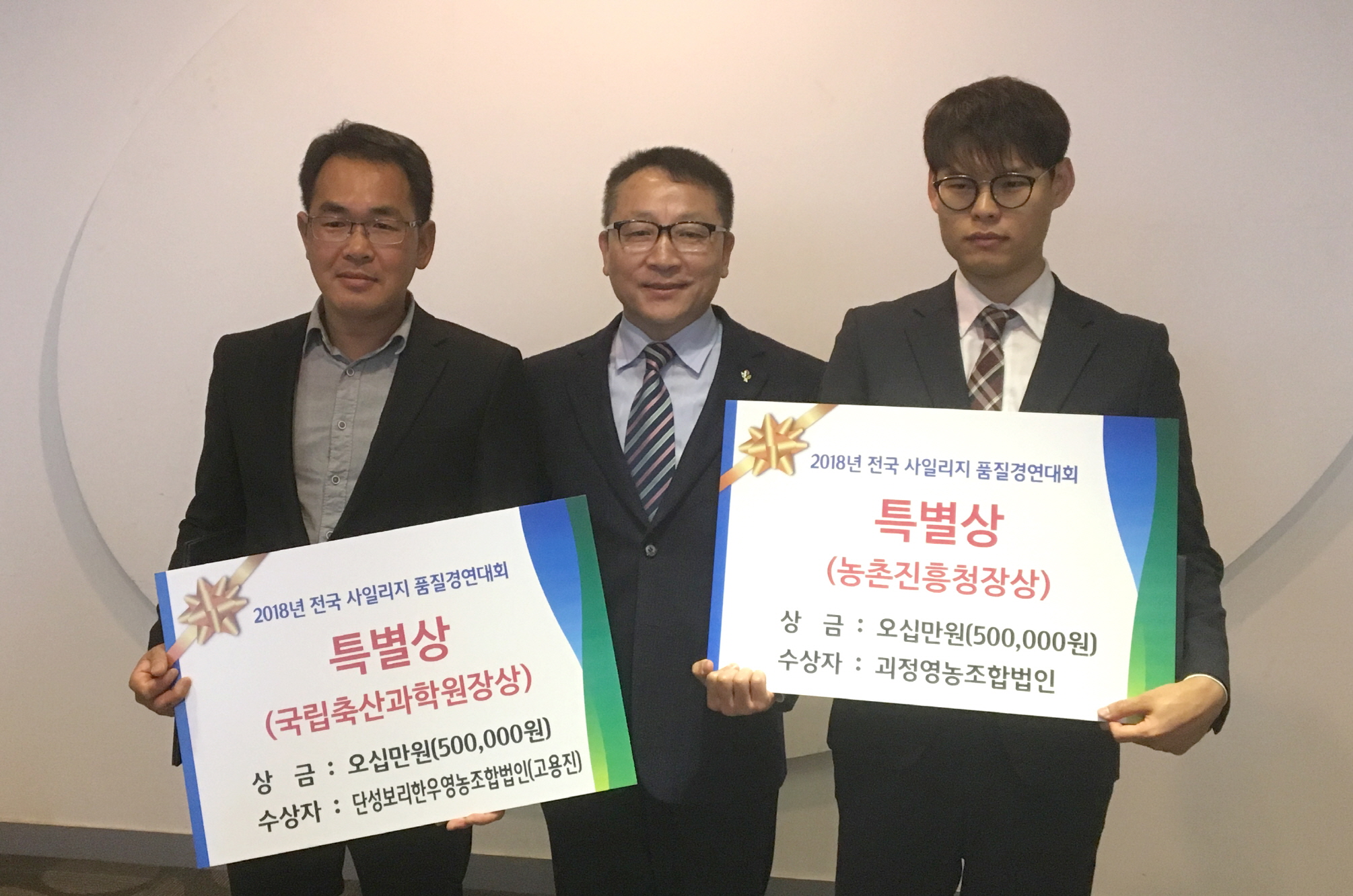 - 순창군 괴정영농조합법인(대표자 권대환)이 15일 경기도 안성 팜랜드에서 개최된 2018년 전국 사료작물 사일리지 품질경연대회에서 특별상인 '농촌진흥청장상'을 수상하는 영예를 안았다.이번 대회는 우수 경영체 시상을 통해 조사료 품질향상과 경영체의 생산의지를 고취하기 위한 것으로 농림축산식품부가 주최하고 농협경제지주에서 주관했다. -2018년 11월 15일-