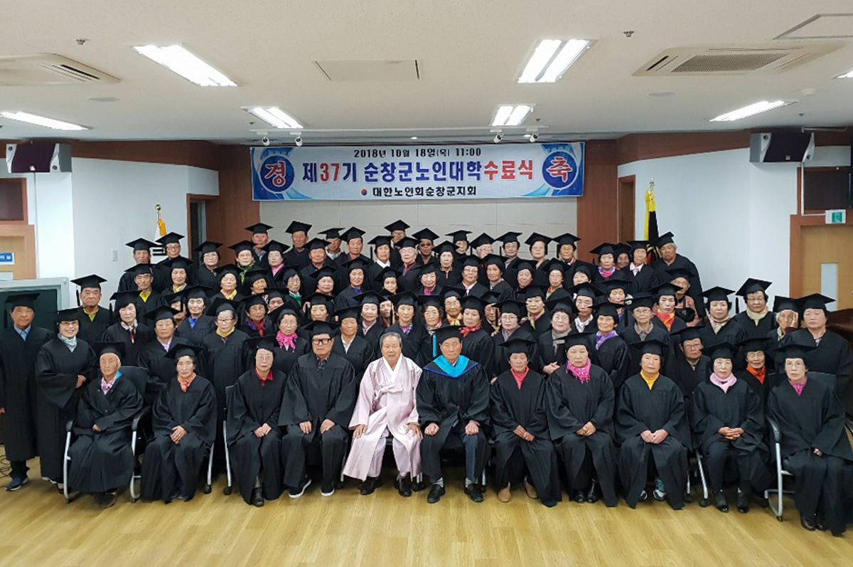 - 대한노인회 순창군지회(지회장 김봉호, 노인대학장 최일천)가 18일 노인회관 3층 강당에서 160여명이 참석한 가운데 제37기 노인대학 수료식을 가졌다.노인대학은 대한노인회 순창군지회가 지난 3월 22일 개강해 매주 목요일마다 제2의 인생설계를 위해 노래교실, 시인특강, 통일강연회, 웃음치료 등 다양한 교육프로그램을 운영하고 있다. -2018년 10월 18일-