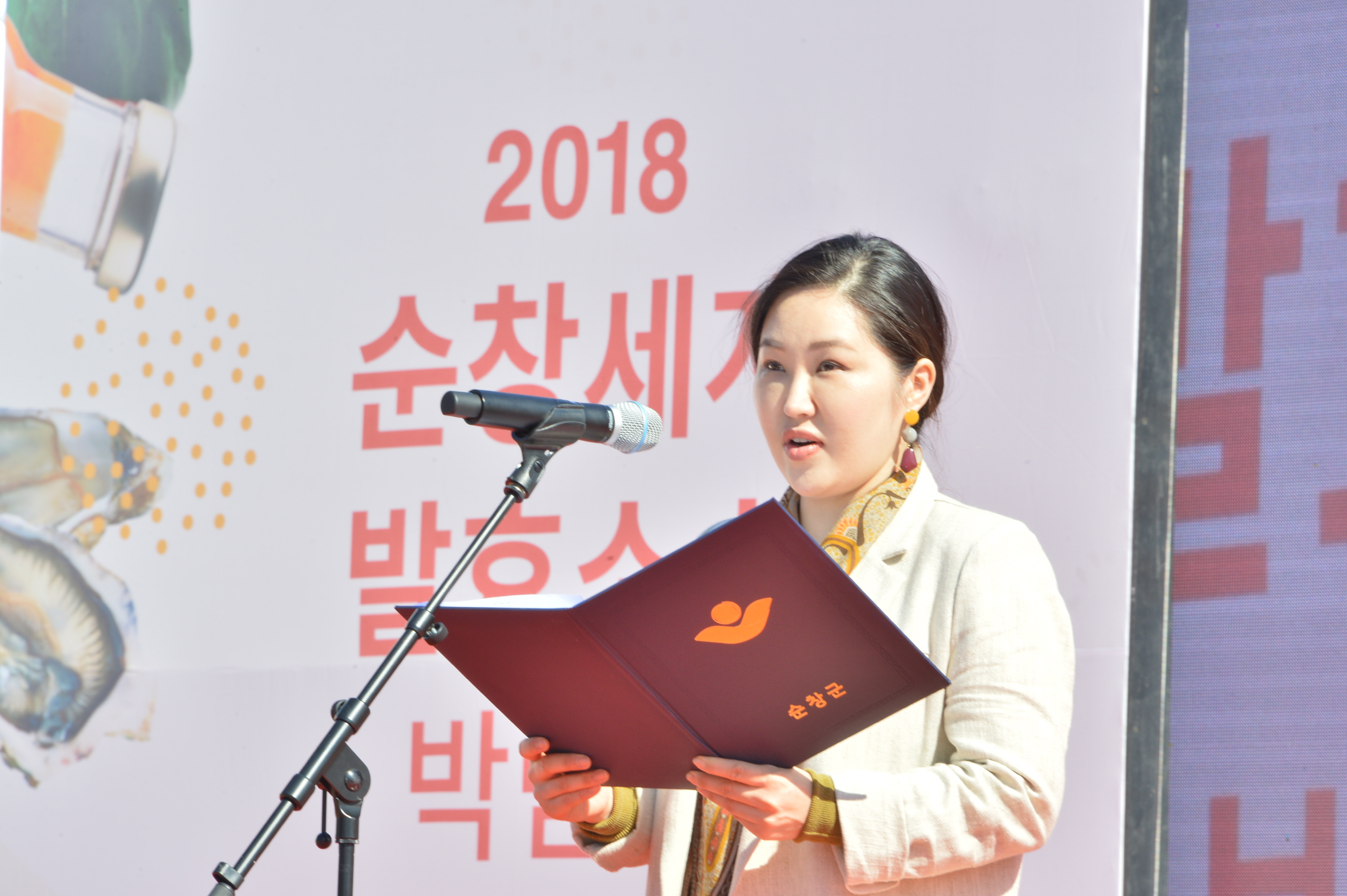 - 순창장류의 소스세계화를 위한 2018 세계발효소스박람회에 서막을 알리는 주)아딸의 이현경 대표가 개회를 선언하고 있다. 이어 황숙주 군수와 정성균 군의장 축사에 이어 여태명 교수의 붓글씨 퍼포먼스가 열렸다. 2018 순창세계발효소스박람회는 기업홍보관, 이벤트관, 콩이공원에 국내 28개 기업과 해외 10여개 기업이 참가해 42개 부스를 운영했다.전세계의 다양한 소스를 맛볼 수 있는 체험의 장과 광장에는 푸드트럭을 배치해 다양한 먹을거리와 함께 다채로운 공연을 감상할 수 있는 장을 마련해 퓨전음악, 비보이 공연, 통기타 공연 등을 펼쳤다. -2018년 10월 19일-