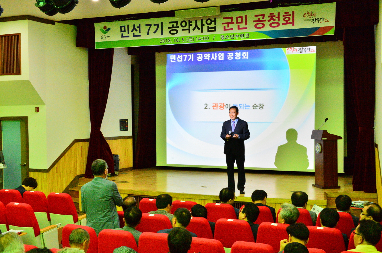 - 5일 순창군 청소년수련관에서 주민 200여명이 참석한 가운데 민선7기 공약사업 공청회를 가졌다.이날 공청회는 황숙주 순창군수를 비롯 순창군의회 정성균 의장, 관내 기관 단체장, 사회단체장 등이 참석해 뜨거운 열기를 보였다.순창군의회 의장의 축사를 시작으로 기획실장의 총괄보고, 순창군수의 공약사업 전반적인 설명과 질의응답 순으로 진행됐다. -2018년 10월 05일-