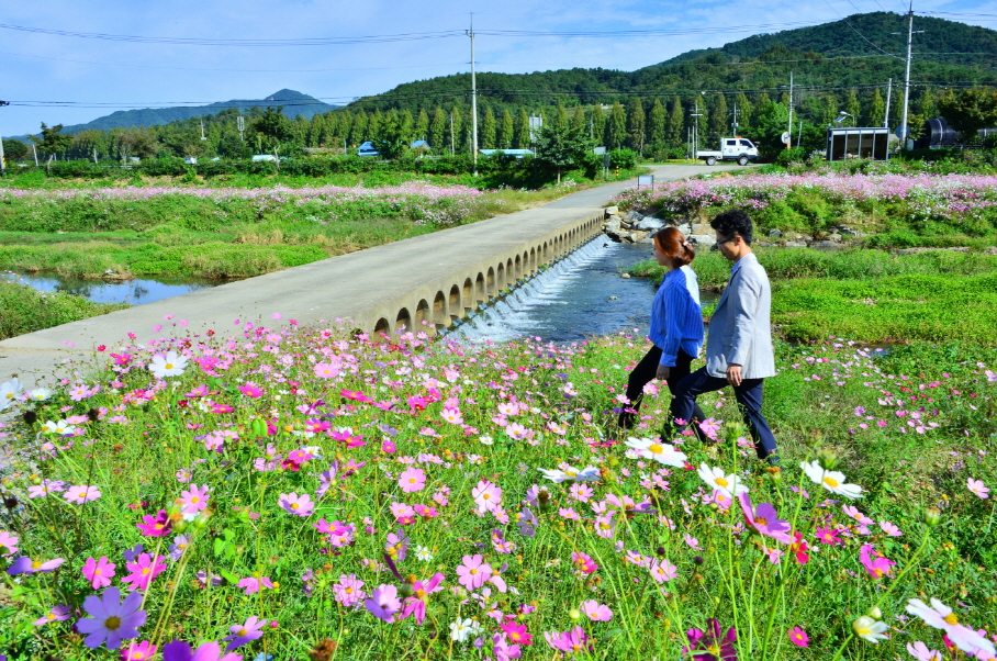 - 순창군 팔덕면 작천변에 코스모스가 만개해 강천산을 찾는 관광객들의 발길을 붙잡고 있다. 팔덕면 구룡리 찬물내기에 위치한 코스모스 단지는 그동안 유채경관단지를 조성하다가 올 가을부터 2ha 규모의 코스모스경관단지로 조성하였다. -2018년 10월 08일-