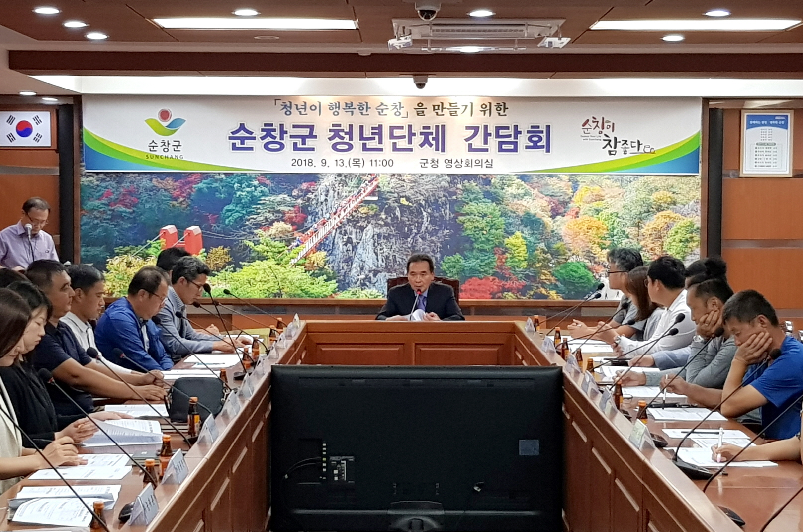 - 13일 군청 영상회의실에서「청년 기본조례」제정과 청년 전진대회 추진을 위한 간담회를 가졌다. 이날 간담회에는 순창군 청년회의소, 귀농귀촌센터, 마을공동체지원센터 등 7개 유관기관과 관련 청년단체 회장 20여명이 참석해 토론의 장을 마련했다.청년 기본조례는 청년의 능동적인 사회 참여기회를 부여하고 청년활동에 대한 지원근거를 마련하는 내용을 담고 있다. 2016년 서울특별시 성북구에서 최초 제정하여 도내 4개 시군에서 시행하고 있다. 군은 2019년 상반기 조례 제정을 목표로 추진 중이다. -2018년 9월 13일-