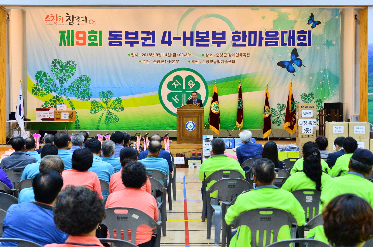 - 제9회 동부권(순창, 남원, 임실, 무주, 진안, 장수) 4-H본부 한마음대회가 14일 순창군 장애인체육관에서 열렸다.이날 행사는 동부권 4-H본부 회원 700여명과 황숙주 순창군수가 참석한 가운데 성황을 이뤘으며, 특강을 시작으로 난타 공연, 개회식, 중식 및 만남의 장, 한마음행사로 진행됐다. -2018년 9월 14일-