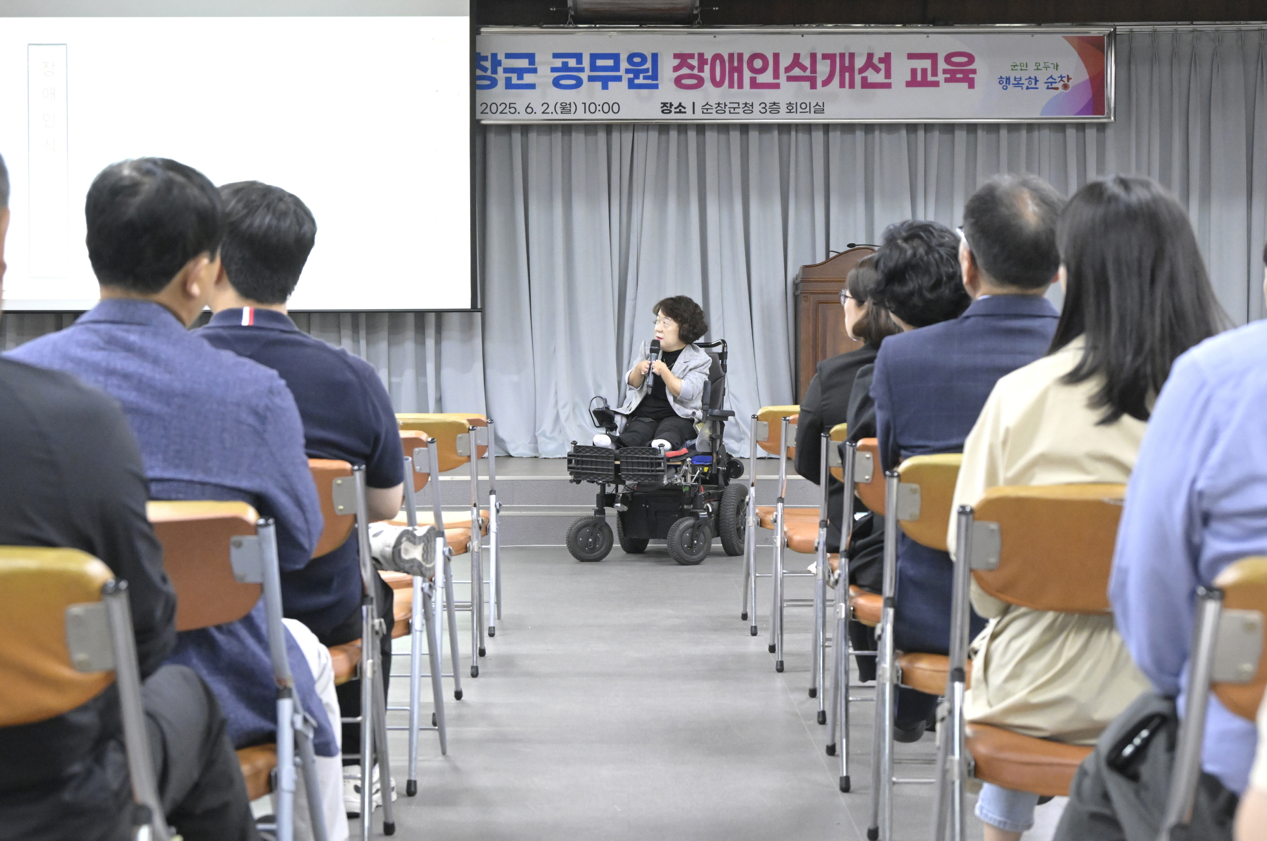 - 2일 군청 3층 대회의실에서 직원 150여 명을 대상으로 장애인식개선 교육을 개최했다. 이번 교육은‘장애인복지법 시행령’제16조에 따라 2023년부터 의무화된 대면교육을 실시한 것으로, 한국장애인개발원 소속 유미 전문강사가 2시간에 걸쳐‘사회적장애인식개선교육'을 진행했다. -2025년 6월 2일-