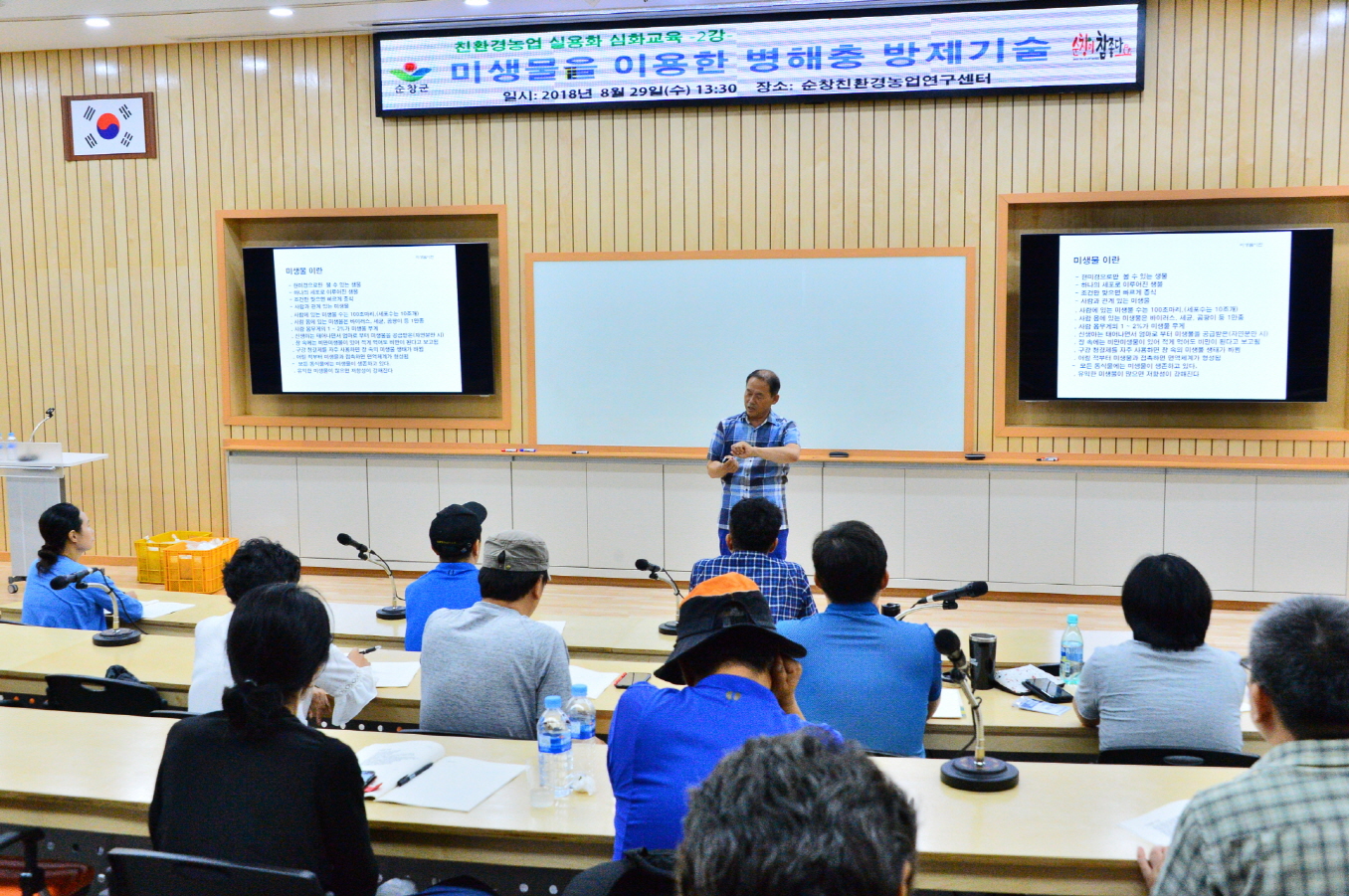 - 29일 친환경농업연구센터에서 ‘유용미생물을 이용한 병해충 방제기술’을 주제로 30여명의 농가들이 참여해 효과적으로 미생물을 농업현장에서 사용할 수 있도록 맞춤형 교육을 진행했다. -2018년 8월 29일-