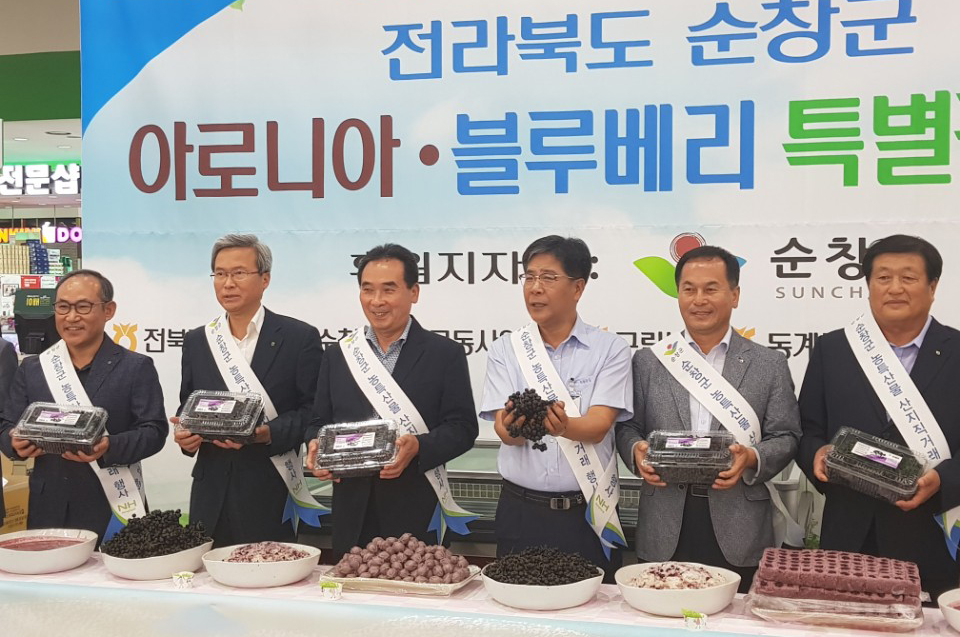 - 10일 서울 양재 하나로유통센터에서 순창군 주최, 순창군조합공동사업법인 주관으로 아로니아 판촉행사를 가졌다. 이날 행사에는 황숙주 군수를 비롯해 유재도 농협전북지역본부장, 한재현 순창군지부장, 유광희 순창군조합공동사업법인 대표이사 등 행정과 농협 30여명이 참여했다. 이번 행사는 올해 135.6ha 면적에서 485농가가 재배하고 있는 아로니아의 생육상태가 평년 수준으로 예상됐으나, 폭염으로 인해 상품성이 없는 불량과가 많이 나오고 가격이 하락되는 등 농가의 어려움을 함께 하기 위해 추진됐다. 아로니아 판매행사는 지난 1일부터 오는 19일까지 계속 진행되는 가운데, 지난 10일 황숙주 군수가 직접 참여하는 깜짝 판촉행사를 통해 아로니아 홍보는 물론 판매액을 대폭 높이는 성과를 거뒀다. -2018년 8월 10일-