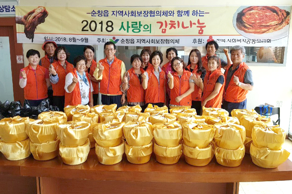 - 10일 순창읍 지역사회보장협의체(공동위원장 김용남, 김종국) 회원들이 폭염에도 저소득층 및 홀몸 어르신들을 위해 사랑의 김치 봉사에 나섰다. 이날 준비한 김치는 배추김치 2kg, 물김치 2kg으로어려운 가정 50세대에 김치를 전달하는 것은 물론 어르신들의 안부를 묻고 따뜻한 말동무가 되어줘 어르신들의 마음을 흡족하게 했다. -2018년 8월 10일-