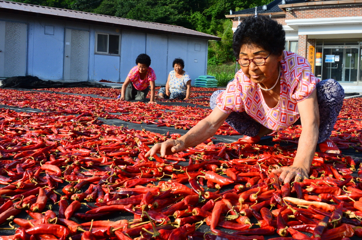 - 쌍치면 먹우실마을 어르신들이 폭염 속에서 태양초 만들기에 나섰다. 연일 폭염으로 “3-5일 정도면 홍고추를 태양초로 만들 수 있다”며 땡볕에도 손놀림이 분주하다. -2018년 8월 13일-
