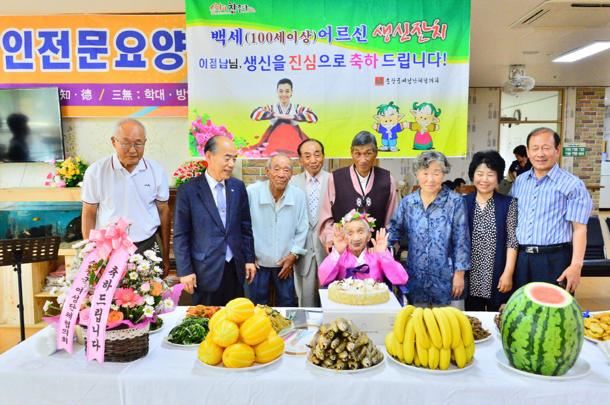 - 13일 순창노인전문요양원에서 올해 100세를 맞은 이정남 어르신의 백세 생신잔치가 가족과 친지들이 모인 가운데 열렸다. -2018년 7월 13일-