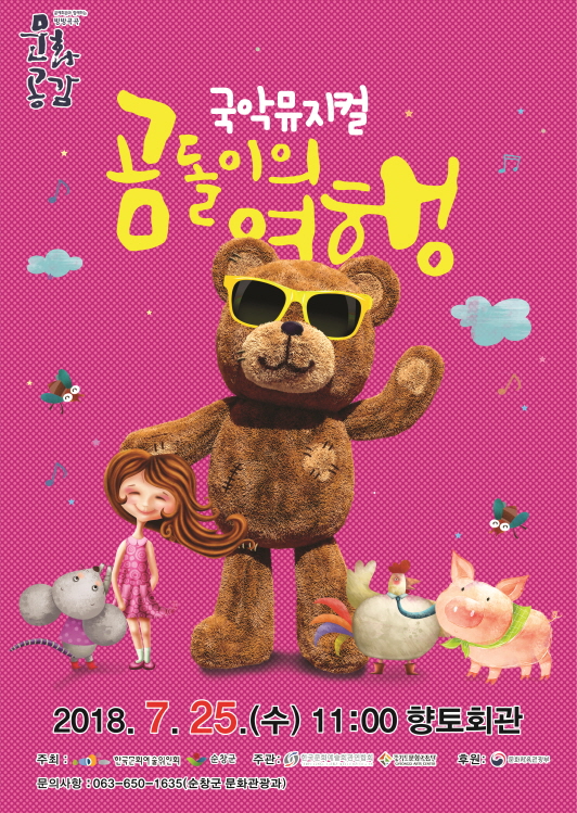 - 순창군은 7월 중 ‘문화가 있는 날’을 맞이해 오는 25일 향토회관에서 국악뮤지컬 ‘곰돌이의 여행’ 을 선보인다. 공연단인 경기도립국악단이 기획한 곰돌이의 여행은 ‘모모’로 유명한 독일의 세계적인 동화작가 ‘마하엘 엔데(Michael Ende)’의 ‘곰돌이 워셔블의 여행’을 모티브로 삼아 탄탄한 스토리라인과 함께 우리 악기와 민요가 어우러진 흥겨운 무대를 선사한다. -2018년 7월 16일-