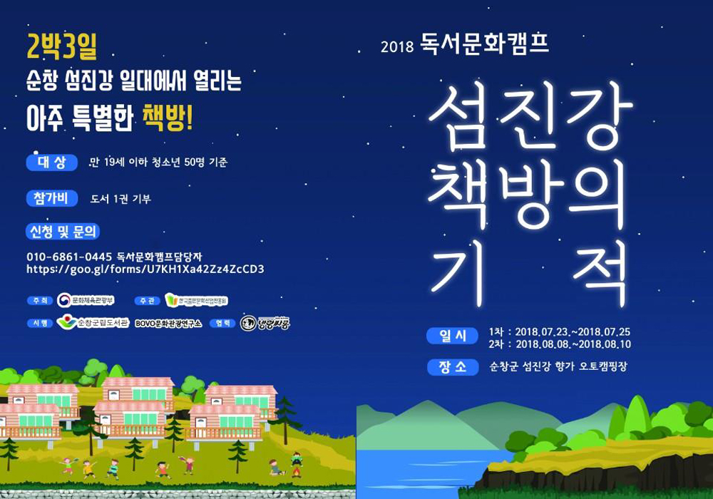 - 순창의 아름다운 섬진강변에서 책과 함께 문화를 만나는 ‘섬진강 독서문화캠프’가 오는 7월과 8월 2박 3일 일정으로 2회 진행된다.순창군립도서관이 문화체육관광부가 주최하고 한국출판문화산업진흥원이 주관하는 ‘2018년도 독서문화 캠프’ 공모사업에 선정돼 추진하며 전국의 청소년 100명과 향가오토캠핑장을 찾는 관광객 등이 함께 참여한다. -2018년 7월 6일-