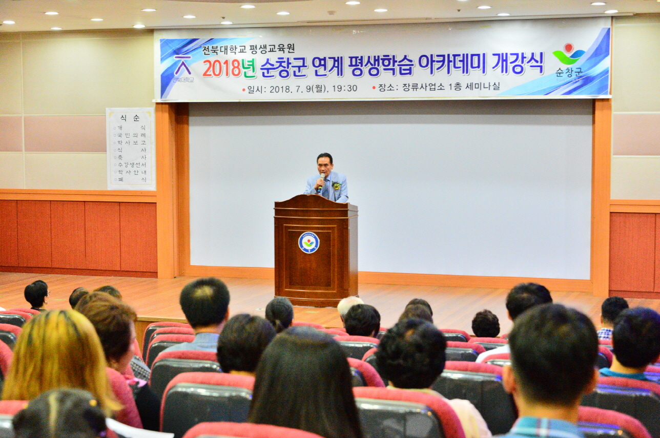 - 9일 장류사업소 세미나실에서 강사와 수강생 70여명이 참석한 가운데 ‘제2회 전북대학교 순창분원 평생학습 아카데미’ 개강식을 가졌다.이날 황숙주 군수, 정성균 군의회 의장과 수강생 등 100여명이 참석한 가운데 학사보고를 시작으로 강사진 소개와 축사, 과정별 오리엔테이션 순으로 진행됐다. -2018년 7월 09일-