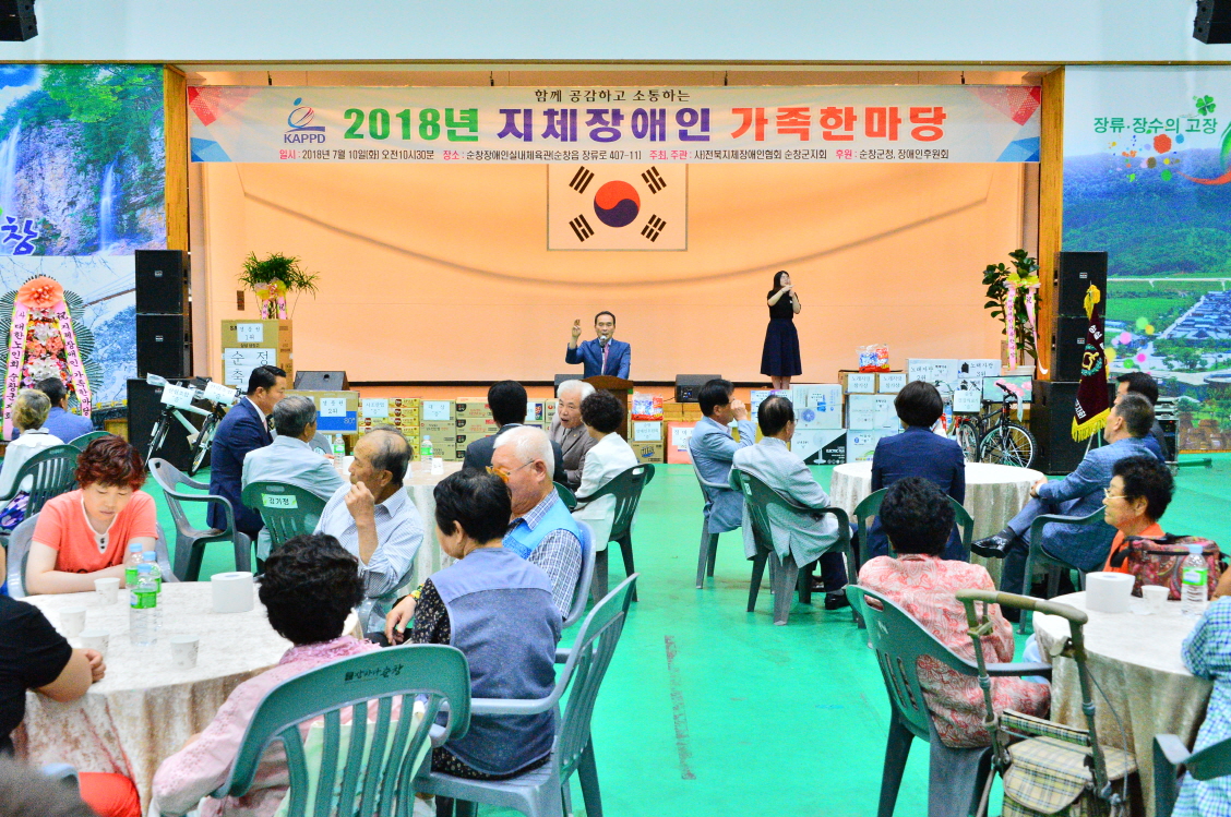 - 10일 지체장애인협회 순창군지회(지회장최기순)은 순창장애인 실내체육관에서 황숙주 군수, 정성균 군의장 및 기관사회단체장 회원 등 300여명이 참석한 가운데 친목과 우의를 다지는 가족한마당 잔치를 개최했다.이날 기념식에 2부에는 순창생활문화예술동호회 난타, 스포츠댄스팀 등 공연에 이어 노래자랑이 이어졌다. -2018년 7월 10일-