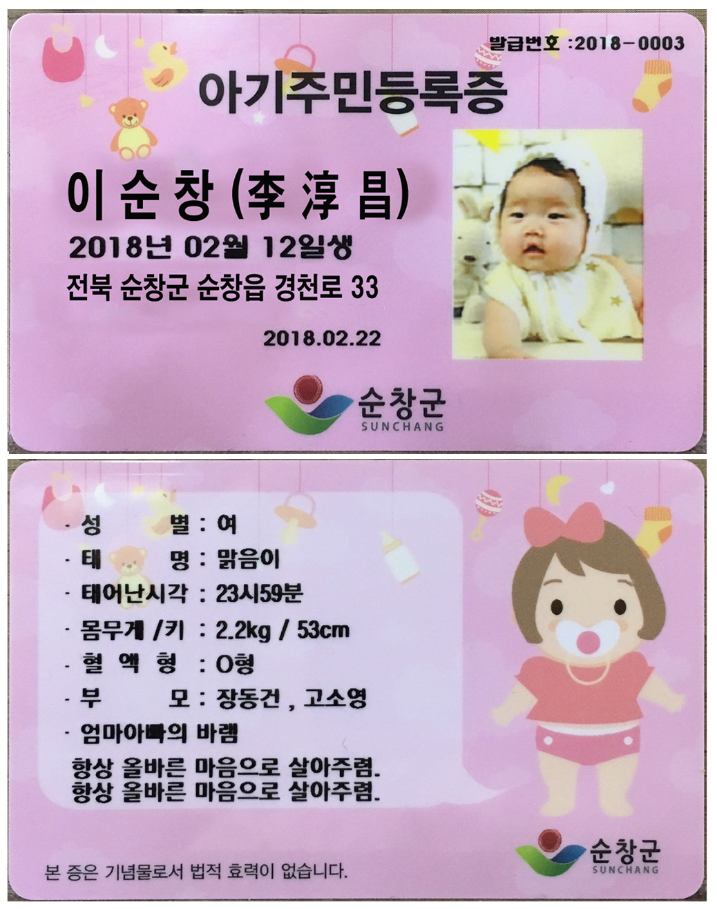 - 순창군, 아기 주민등록증 발급