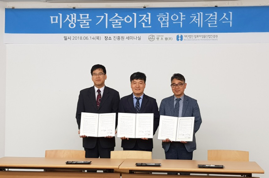 - (재)발효미생물산업진흥원은 농업회사법인 렛츠팜과 통상실시 계약을 통해 사카로마이세스 세레비지애 SRCM100936 균주를 1억원에 판매 했다. 사카로마에스 세레비지애 SRCM100936균주는 주로 단백질 음식을 함유한 식재료가 발효하는 과정에서 생성되는 유해물질인 바이오제닉아민이 생성되지 않는 균주로 주로 베리류 와인 제조를 위해 주로 사용된다. (재)발효미생물산업진흥원이 연구해 특허권을 획득했다. 이번 계약 체결로 렛츠팜은 사카로마에스 세레비지애 SRCM100936균주를 향후 5년 동안 반려동물 펫 사료 제조용 균주로 사용할 수 있게 된다. -2018년 6월 22일-
