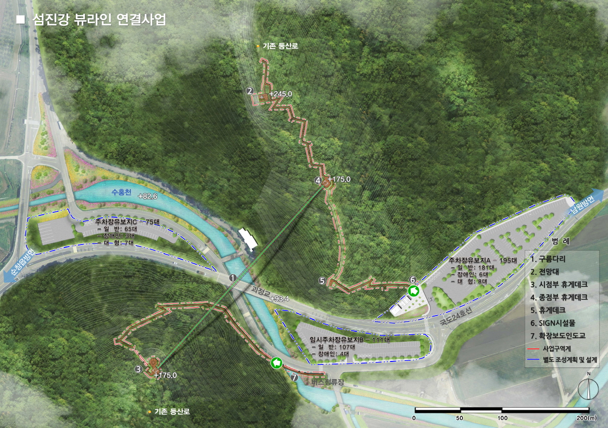 - 순창군 적성면 채계산에 270m 길이의 국내 최대규모 구름다리 설치를 중심으로 한 섬진강 뷰라인 연결사업이 오는 5월에 착공할 예정이다.군은 기본 실시설계 용역을 발주하고 기술자문위원회를 거쳐 공법과 자재 선정을 지난해 완료하고 전라북도의 원가심사 결과가 나오는 5월에는 사업을 본격 착수할 계획이다.섬진강 뷰라인 연결사업은 순창군 적성면 괴정리에 위치한 채계산 중턱 75~90m지점에 270m 길이 구름다리와 산책로, 모험(어드벤쳐)전망대 1개소를 설치하는 사업이다. 내년까지 국비 34억을 포함해 총 68억원이 투자되며 내년 3월이면 정식 개통할 수 있을 것으로 전망하고 있다. -2018년 04월 17일-