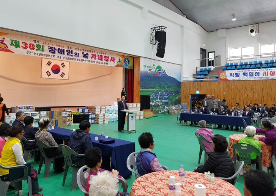 - ‘제38회 장애인의 날 기념행사’가 17일 장애인체육관에서 성대하게 열려 장애우와 비장애우들이 함께 어울려 하나가 되는 의미 있는 시간이 됐다. 이날 행사에는 장명균 부군수와 지역 장애우, 자원봉사자 등 500여명이 참석한 가운데장애인인권헌장낭독,모범장애인 표창,장애인의 날 기념 백일장 수상자 상장수여, 한국부인회의 장학금전달, 어울림한마당순으로진행됐다. -2018년 04월 18일-