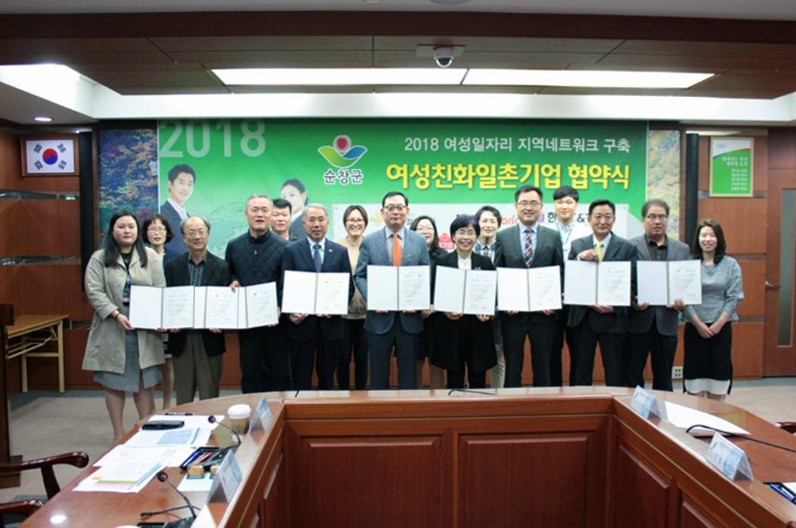 - 3일 군청 영상회의실에서 전북광역여성새로일하기센터(센터장 이윤애)주관으로 농업회사법인 한국절임, (주)대한패브릭순창공장, (주)기픈샘, 토박이순창식품(주), 한국씨앤티(주), 토당식품영농조합법인, (주)순창가족식품, (주)로터스 대표 및 임직원이 참석한 가운데 여성친화 일촌기업 협약식이 열렸다. -2018년 04월 03일-