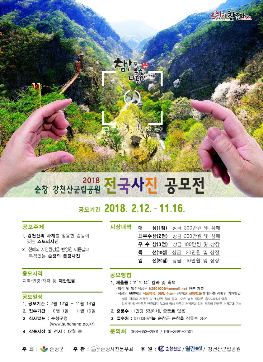 - 순창군이 주최하고 순창사진동우회가 주관하는 ‘2018 강천산군립공원 전국사진 공모전’이 열린다.강천산의 사계절 변화에 따른 자연경관을 활용한 스토리사진 및 순창의 특색 있는 풍경사진을 주제로 지역, 연령, 자격 등의 제한 없이 누구나 참여 할 수 있다. 시상규모는 대상 1점에 상금 300만원, 최우수상 2점에 각 200만원, 우수상 3점에 각 상금 100만원과 특선, 입선 등을 포함해 총 96점을 선정 할 계획으로 심사결과는 오는 12월 순창군청 홈페이지를 통해 발표되고 개별통지 한다. -2018년 02월 20일-