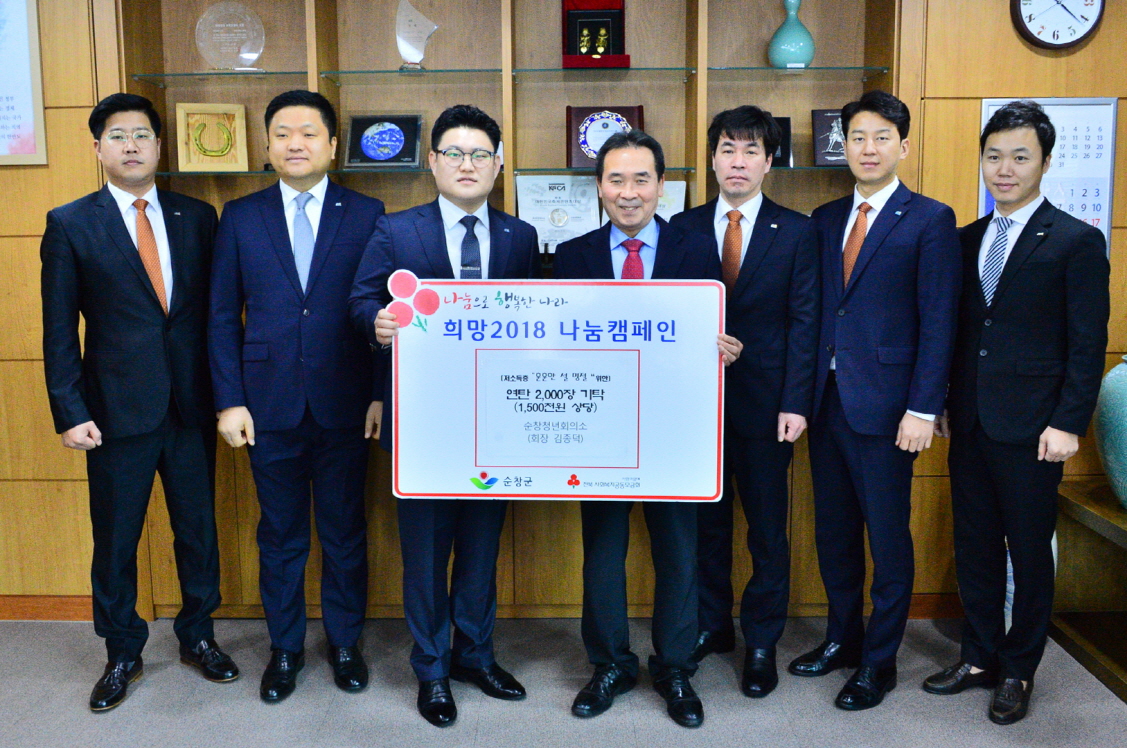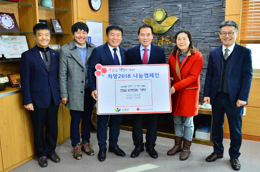 - 순창군산림조합(조합장 김상범)은 12일 순창군청을 찾아 어려운 이웃을 위해 써달라며 5,000만원을 기탁했다. -2018년 2월 12일-