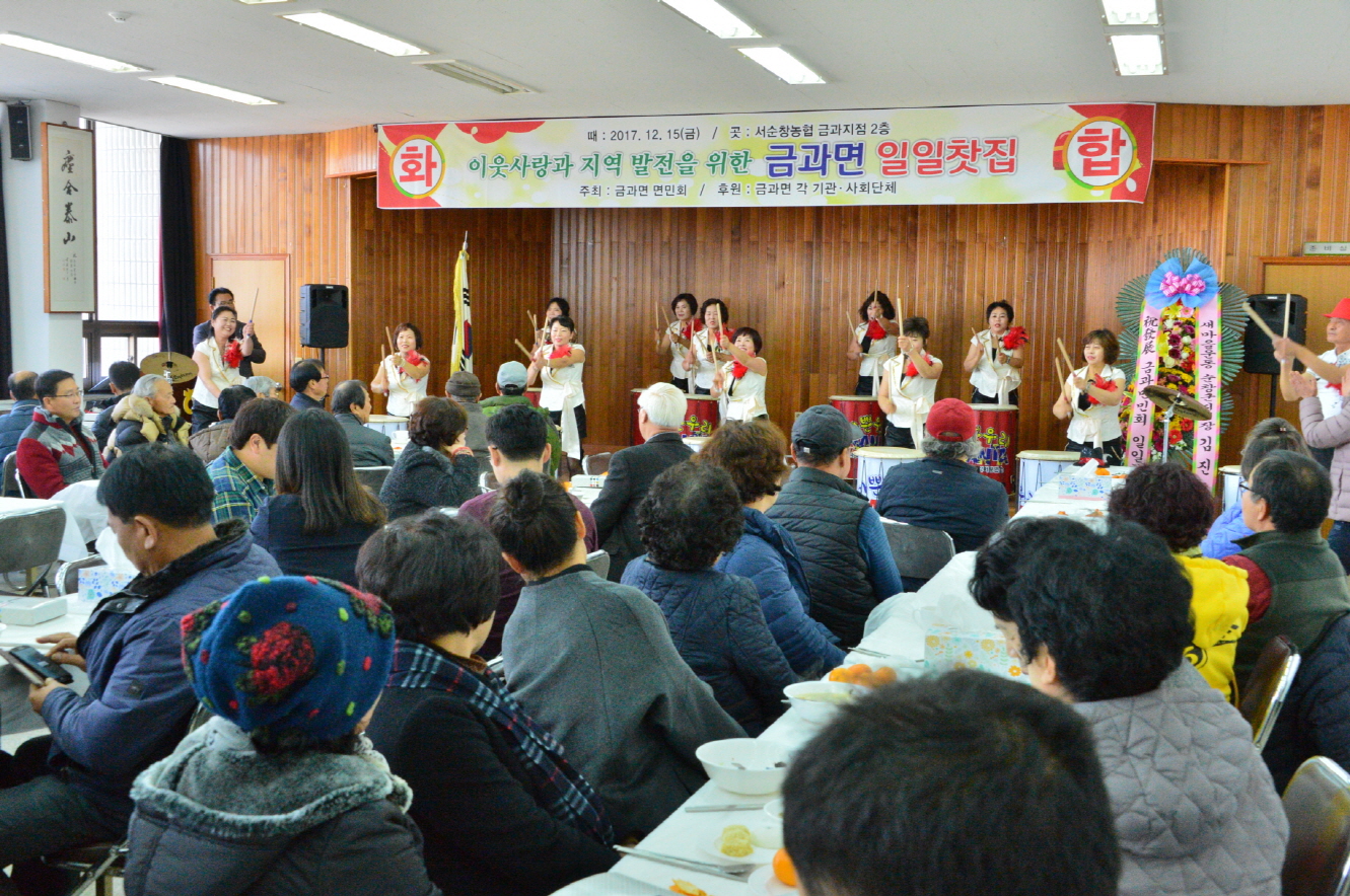 - 순창군 금과면민회(회장 양걸희)는 연말연시를 맞아 어려운 이웃을 돕고 지역발전을 위한 기금마련을 위해 15일 서순창농협 금과지점 2층 대회의실에서 일일찻집이 열어 성황을 이뤘다.이날 금과면 주민자치센터 난타공연과 떡국 나눔으로 시작한 일일찻집은 지역주민, 향우 등 300여명이 참여한 가운데 5천5백만 원의 기금을 마련하였다. -2017년 12월 15일-