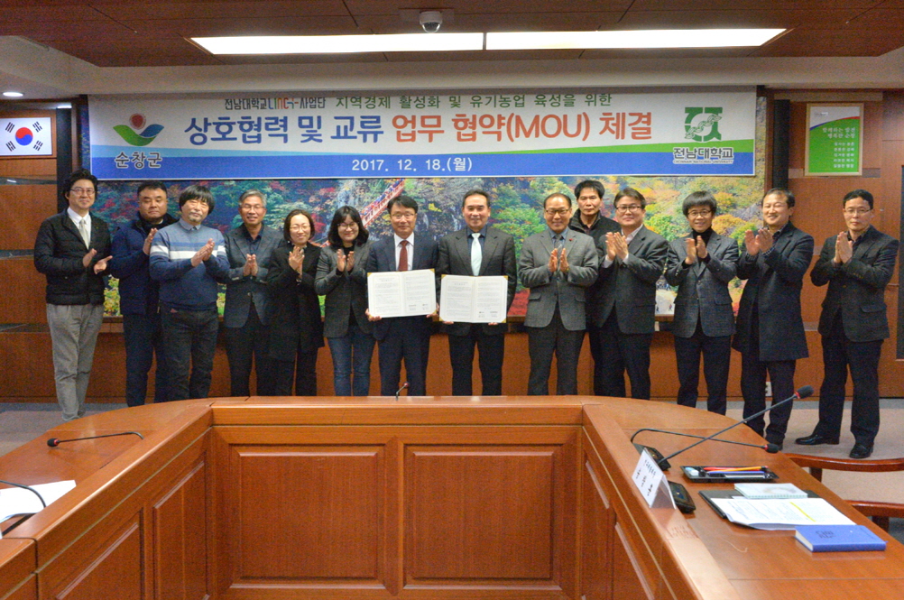 - 순창군과 전남대학교 사회맞춤형 산학협력선도대학육성사업단(이하 ‘전남대학교 LINC+사업단’)은 최근 18일 군 영상회의실에서 지역경제 활성화 및 유기농업 육성을 위한 업무협약을 체결했다.이날 협약식에는 황숙주 순창군수, 이구연 군 농업기술센터소장 등 관계자와 전남대학교 정병석 총장과 김재국 전남대학교LINC 사업단장, 김길용 농식품생명화학부 교수 등 양측 관계자 20여명이 참석했다. -2017년 12월 18일-