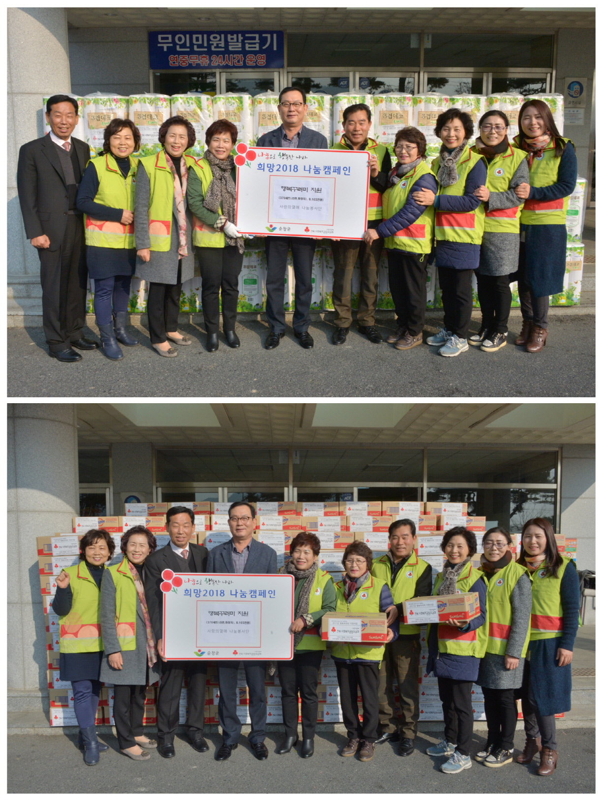 - 사랑의 열매 나눔봉사단은 나눔으로 행복한 나라로 실천하기 위해 희망2018 나눔캠페인으로 행복꾸러미 라면과 화장지 1370세트 8,103천원 상당을 전달했다. –2017년 11월 29일-