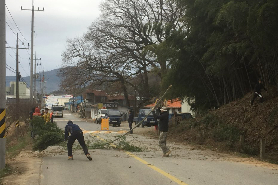 - 금과면청년회(회장 이동훈) 회원 20여명은 지난 2일 금과면 매우마을 앞 빙판길 사고위험 구간 수목제거 봉사활동에 구슬땀을 흘렸다.금과면 청년회는 단합대회를 위해 국내여행을 가기로 했으나 금과면 초입 매우마을앞 주도로가 겨울철이면 그늘져 빙판길 사고 위험이 있어 수목제거 봉사활동으로 대신했다. 매우마을 앞 도로는 대나무와 잡목이 도로표지판을 가리고 있어 빙판길 사고위험 구간으로 인식되어 있었다.이에 빙판길 사고 위험이 있는 위험요소를 제거하고 피해 방지를 위해 우거진 대나무와 수목을 제거에 나서 면민들로부터 호평을 받았다. -2017년 12월 04일-