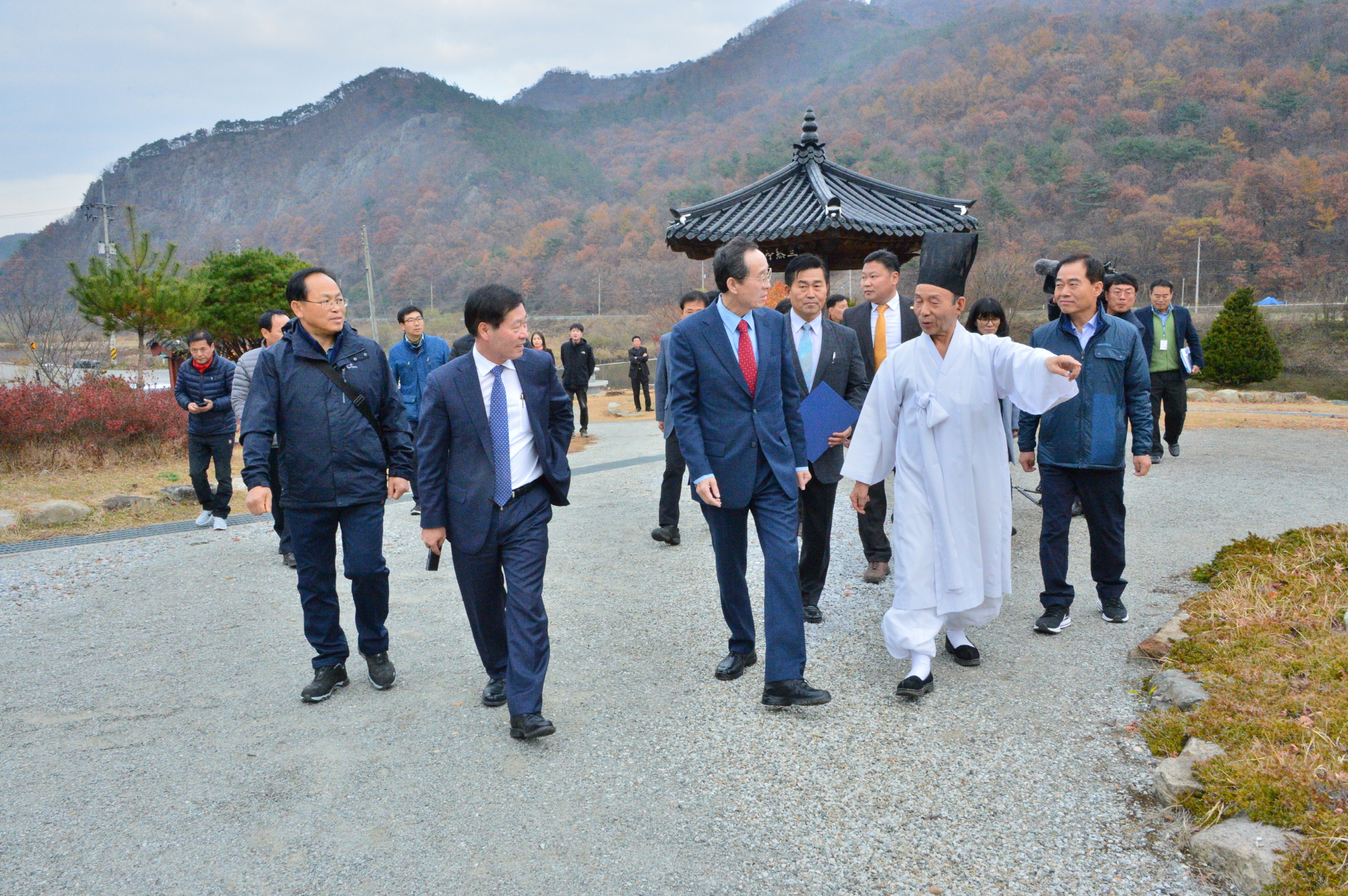- 송하진 도지사는 13일 친환경연구센터 준공식 후 전라도 정도 1000년을 기념해 전북의 생태, 역사, 문화가 숨쉬는 ‘전북1000리’길 선정을 위해 장명균 부군수, 김충호 산장과 관계자들과 함께 선비길을 탐방했다. -2017년 11월 13일-