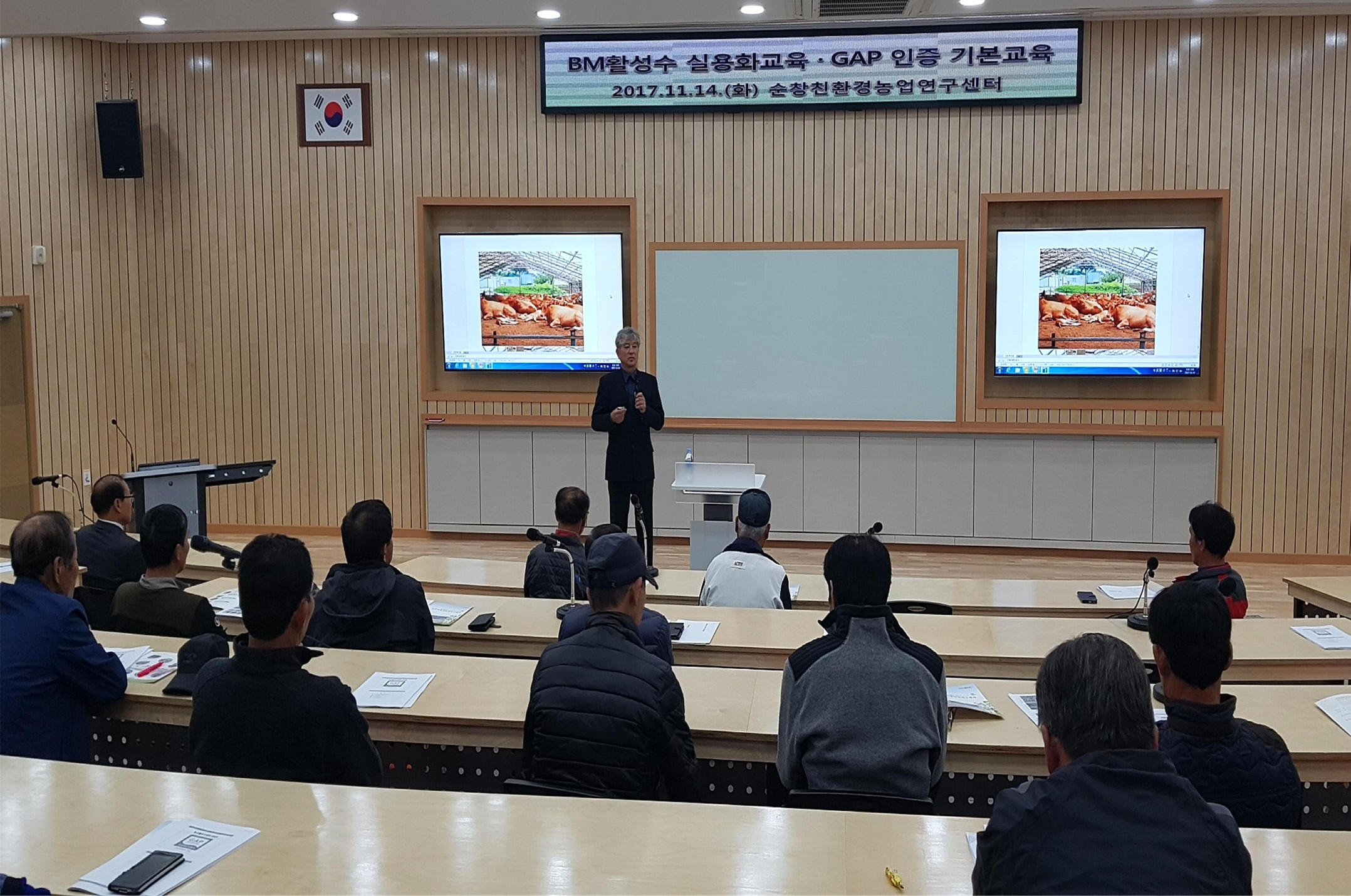 - 14일 친환경농업연구센터 강당에서 친환경농업인 60여명이 참여한 가운데 BM활성수 실용화 및 농산물우수관리(GAP) 인증 기본 교육을 진행했다. BM활성수는 자연계에 가장 핵심적인 구성요소인 미생물(박테리아 B), 광물질(미네랄 =M), 물(워터 =W)의 상호 공생 관계로 이루어진 강력한 토양미생물이 유기물을 분해하여 천연수를 만들어 내는 자연순환시스템으로 각종 미네랄과 효소, 호르몬, 유기산 등을 함유한 활성수다. -2017년 11월 14일-
