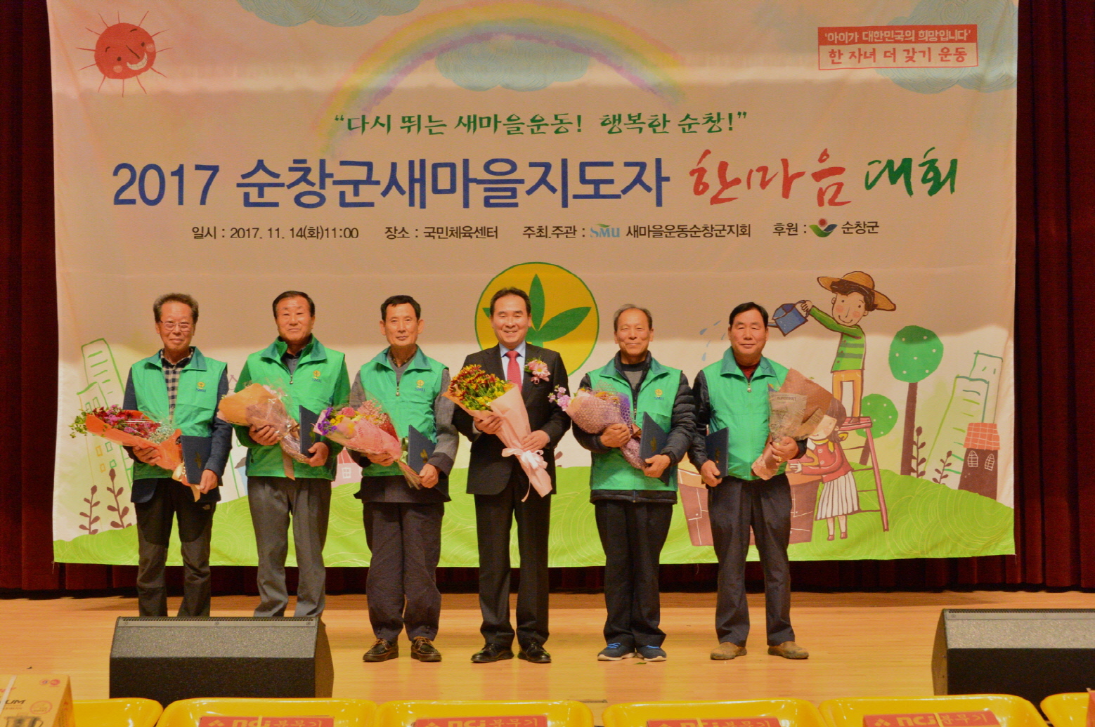 - 새마을운동순창군지회(회장 김진홍)는 14일 순창국민체육센터에서 2017순창군새마을지도자 한마음대회를 개최하여 지역사회 발전과 이웃사랑 실천에 앞장서 온 읍.면 새마을지도자들과 부녀회장들의 노고를 격려하고 상호간 정보교환과 화합 장을 마련했다. -2017년 11월 14일-