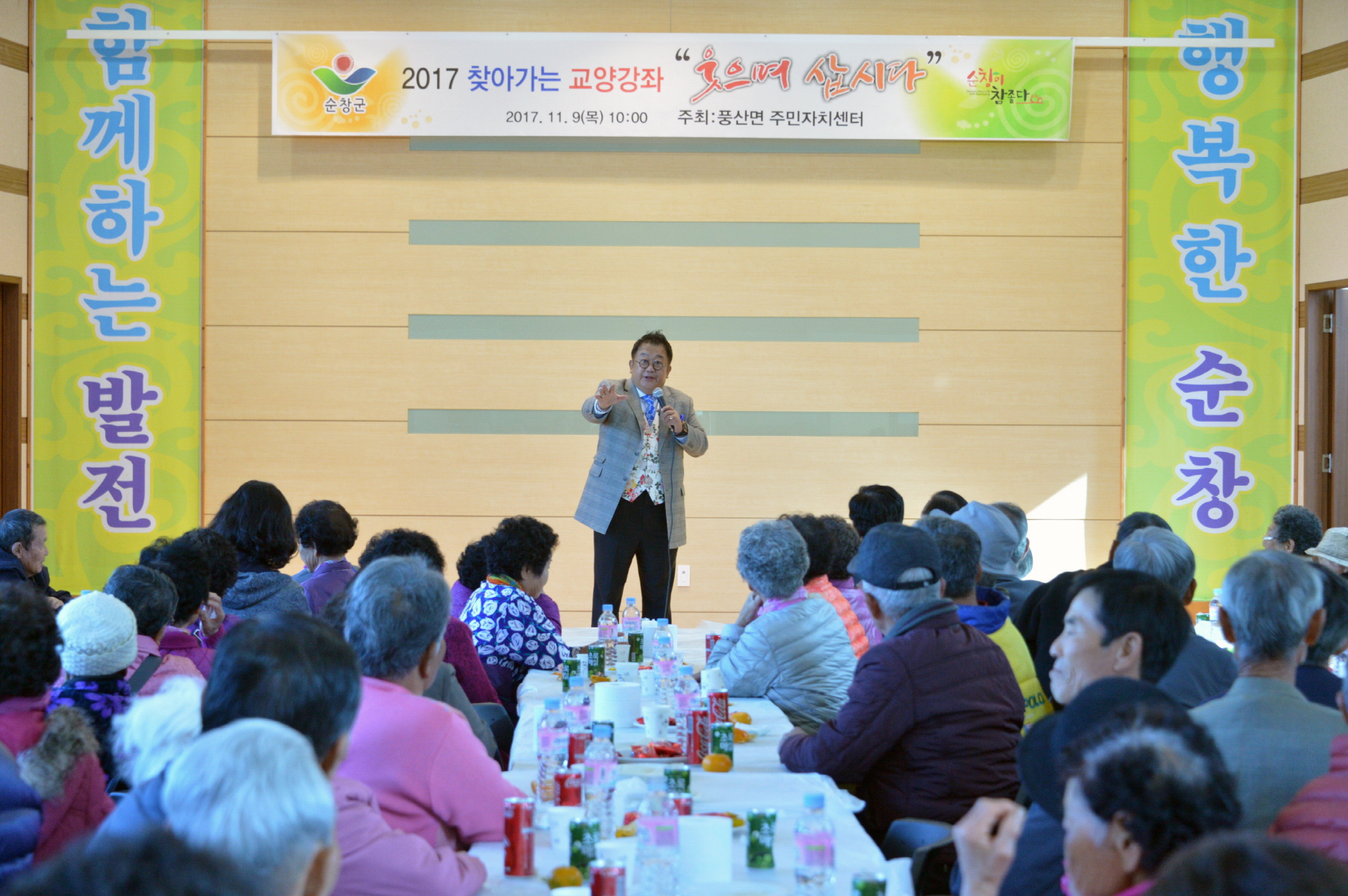 - 풍산면 사회복지협의회에서는 9일 풍산면사무소 강당에서황숙주 순창군수, 김종섭 군의회 의장, 최영일 도의원을 비롯한 군의원들과 많은 기관·사회단체장들이 참여한 가운데 70세 이상 어르신 200여명을 초청한 가운데 경로위안잔치를 열었다.이날 개그맨 이용식 씨를 초빙해 ‘웃으며 삽시다.’라는 주제의 교양강좌를 열었고, 특별공연으로 난타, 풍물놀이, 노래공연 등을 준비해 참석한 어르신들에게 흥겨운 무대를 선보였다. -2017년 11월 09일-