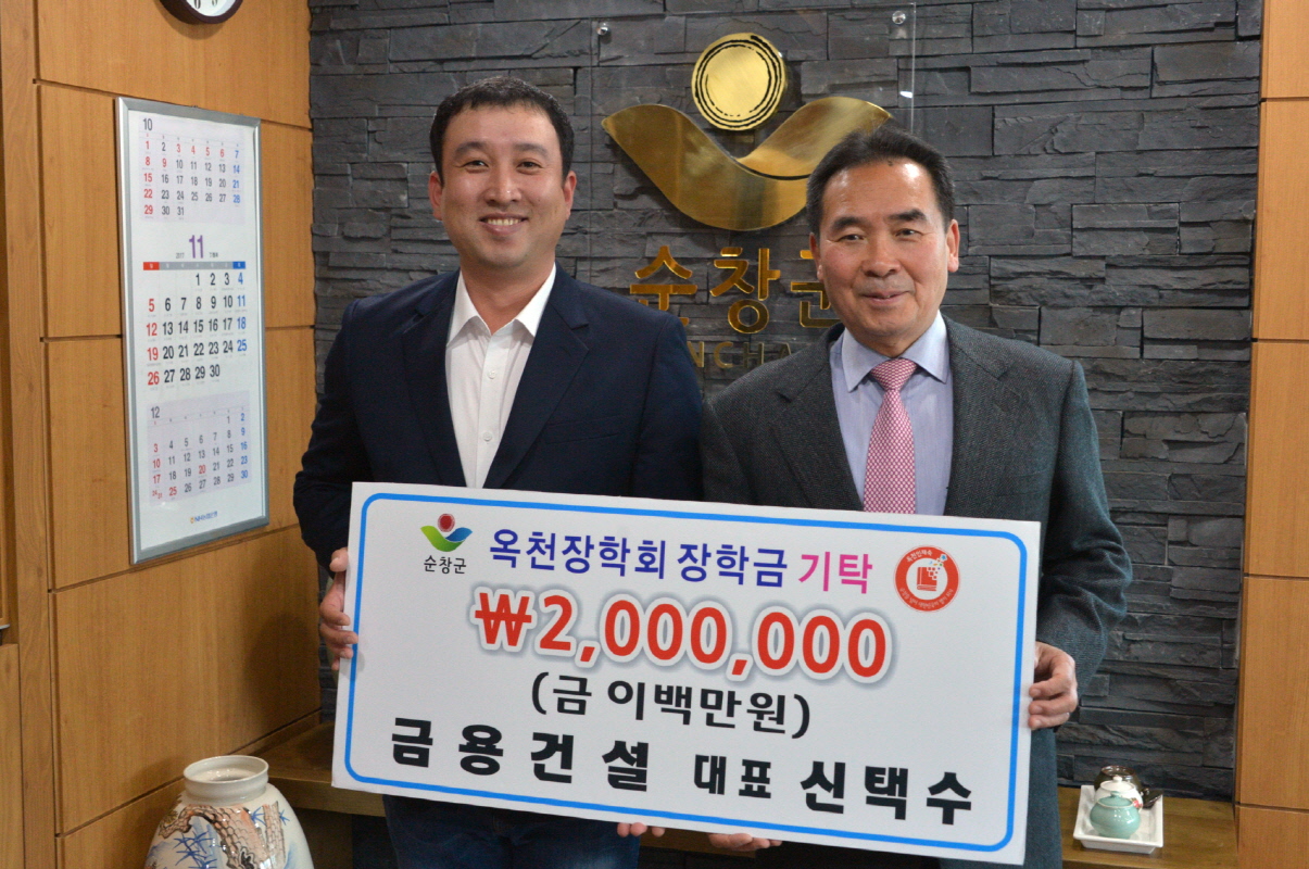 - (유)금용건설산업 신택수 대표가 순창군의 지역인재양성을 위한 장학금에 써달라며 옥천장학회에 200만원을 전달했다. 순창군 옥천장학회는 2007년부터 현재까지 240여명의 순창군 지역 학생에게 약 3억 5천여만원의 장학금을 지급하고 있다. -2017년 11월 09일-