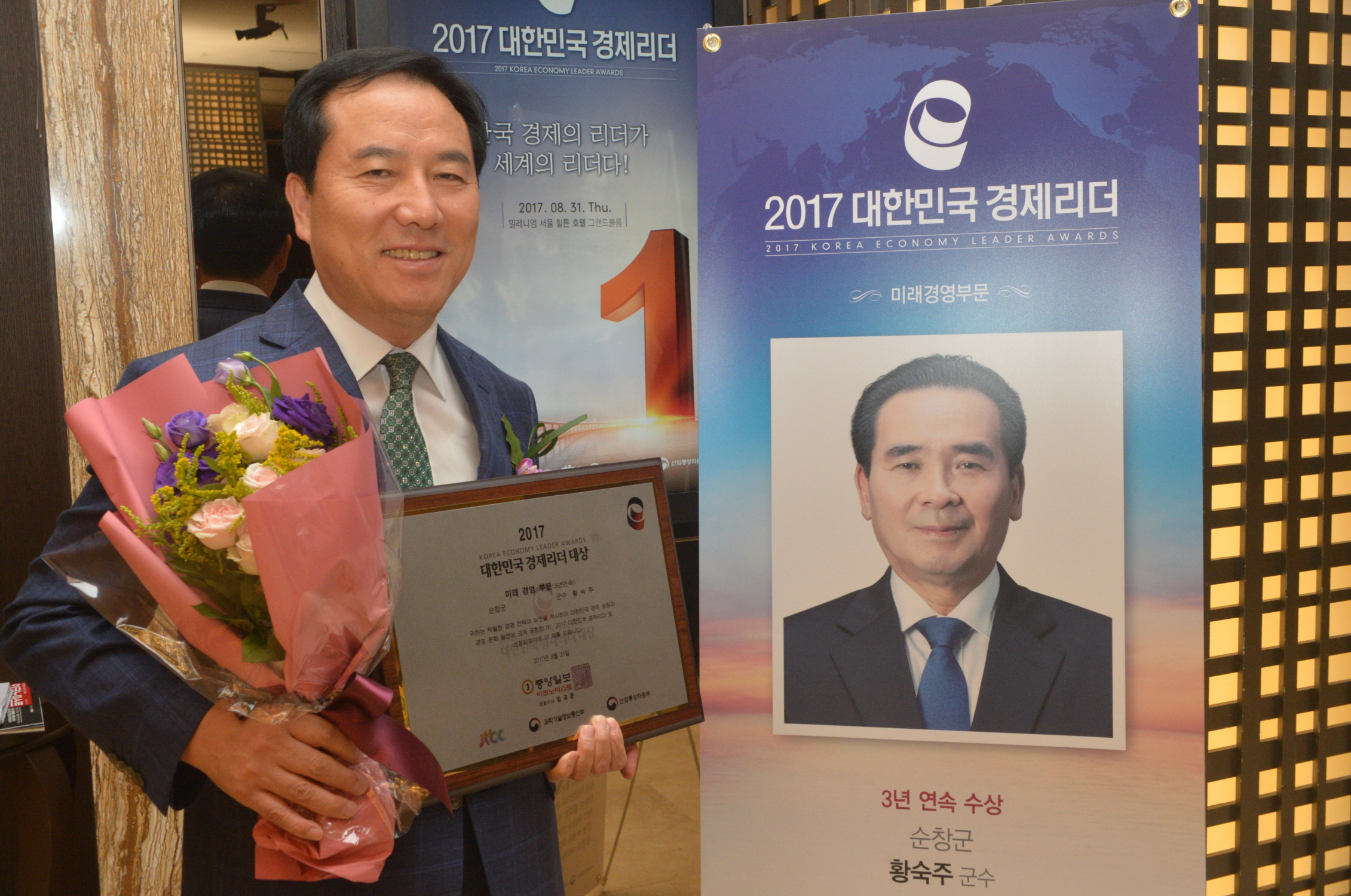 - 황숙주 순창군수가 ‘2017 대한민국 경제리더 대상 미래경영부문에서 대상을 수상해 31일 밀레니엄 서울힐튼호텔에서 양동엽 기획실장이 대리 수상의 영광을 안았다.대한민국 경제리더 대상은 지자체와 공기업, 기업 등에서 경제발전을 주도한 최고경영자를 선정해 한국형 리더의지표로 삼기위해 시상하는 상으로 올해로 8회째를 맞고 있다. -2017년 8월 31일-