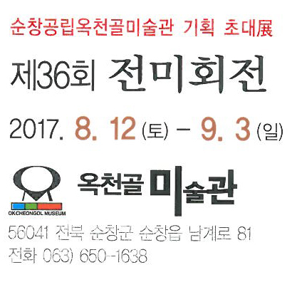 - 옥천골미술관에서는 전북을 대표하는 구상작가들의 제36회 전미회전이 8월 12일부터 9월 3일까지 열린다.전미회는 전북을 대표하는 구상작가들로 원로작가, 중견작가, 젊은작가들이 중심되어 1980년 창립해 전북지역 미술발전에 기여하고 있다. -2017년 8월 14일-