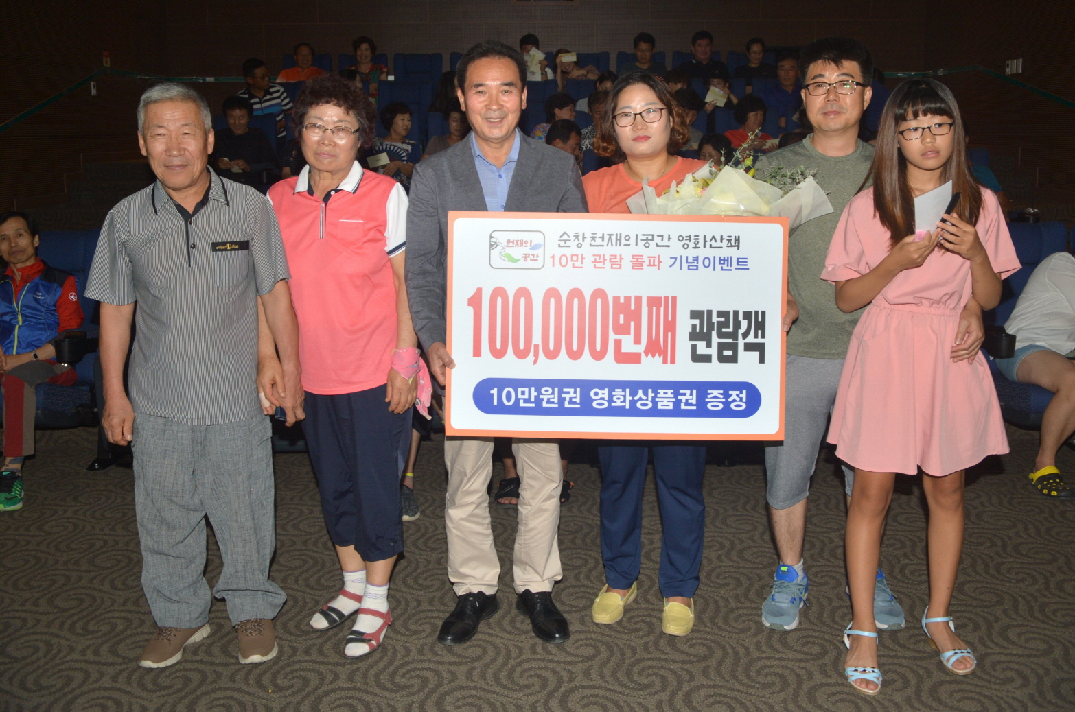 - 12일 순창작은영화관인 ‘천재의 공간 영화 산책’ 이 2015년 10월 26일 개관한지 1년 10개월만에 10만 명을 돌파했다.10만번째 행운의 관람객 주인공은 가족과 함께 영화관을 찾은 구림면 밤재흑염소 박연홍(44, 여)씨로 10만원 상당의 무료 관람권을 증정하고 같은 상영관에서 영화를 관람한 관객 전원에게 만원권 무료관람권을 증정하는 이벤트도 가졌다. -2017년 8월 14일-